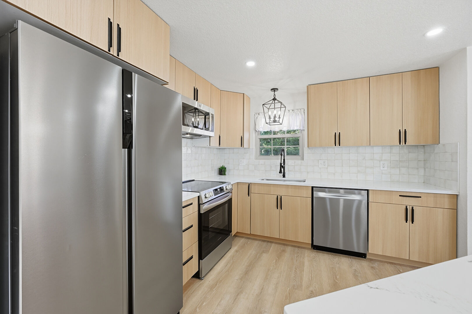 Baseboards Wall, Drywall, L Shaped Kitchen, Natural Light, Notable Chandelier, Recessed Lighting, Textured Ceiling, Wood Finish Floor, Drywall, Wood Finish Floor