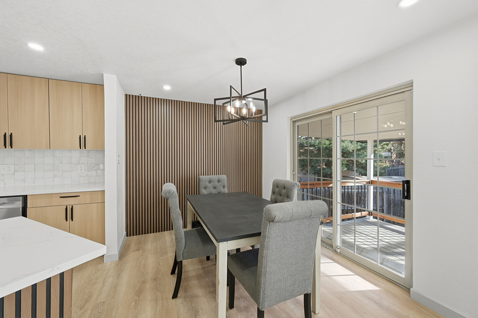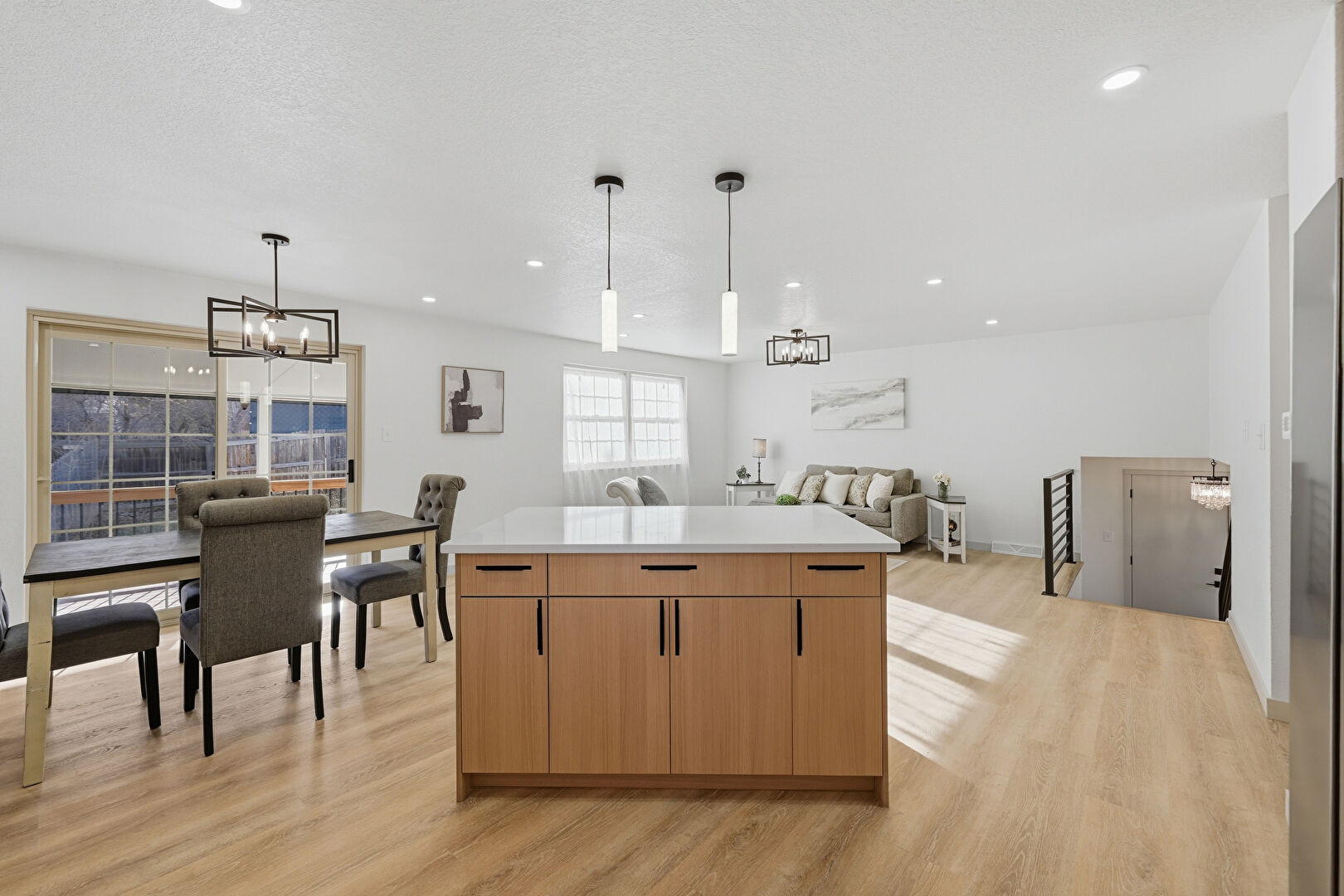 Baseboards Wall, Drywall, L Shaped Kitchen, Notable Chandelier, Recessed Lighting, Textured Ceiling, Wood Finish Floor, Drywall, Natural Light