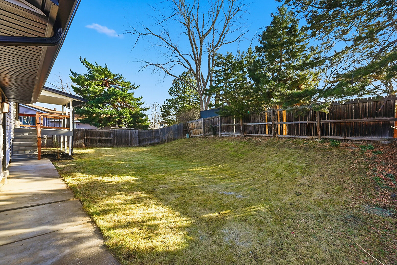 Brick Siding, Chimney, Concrete Foundation, Downspout, Fence, Gutters, Horizontal Siding, Lawn, Driveway