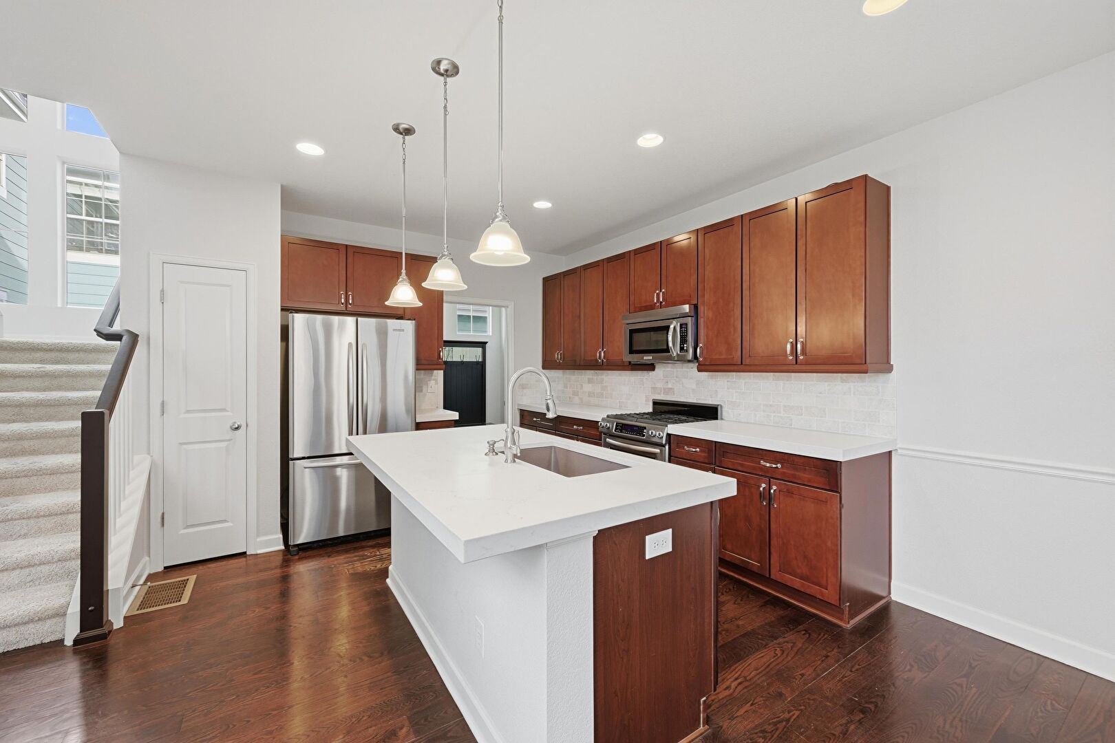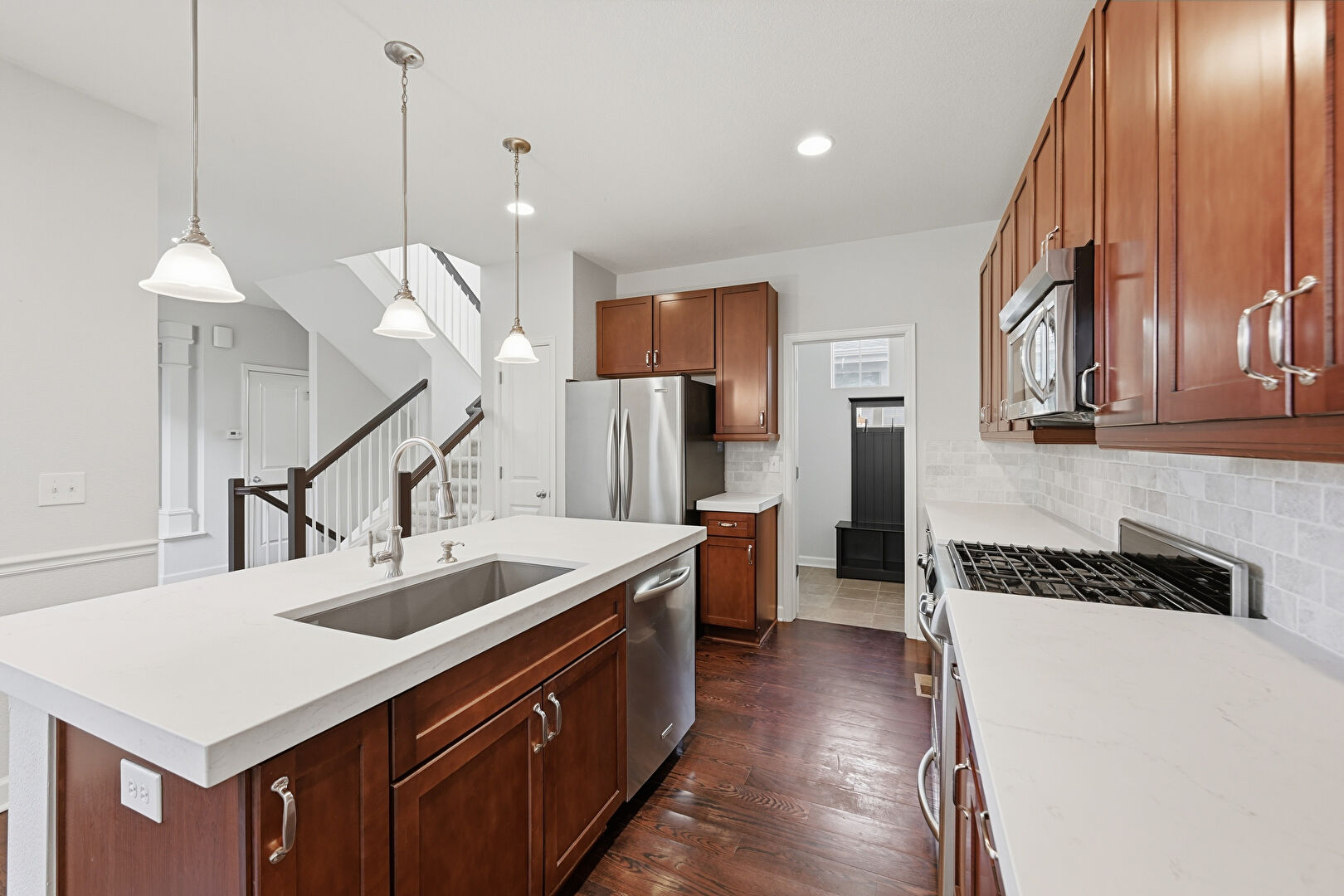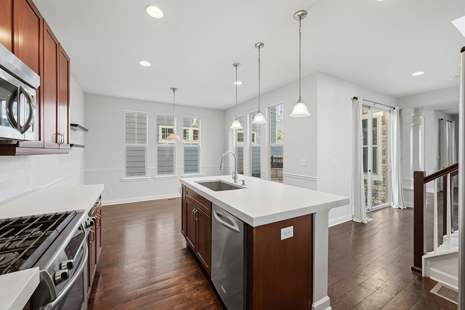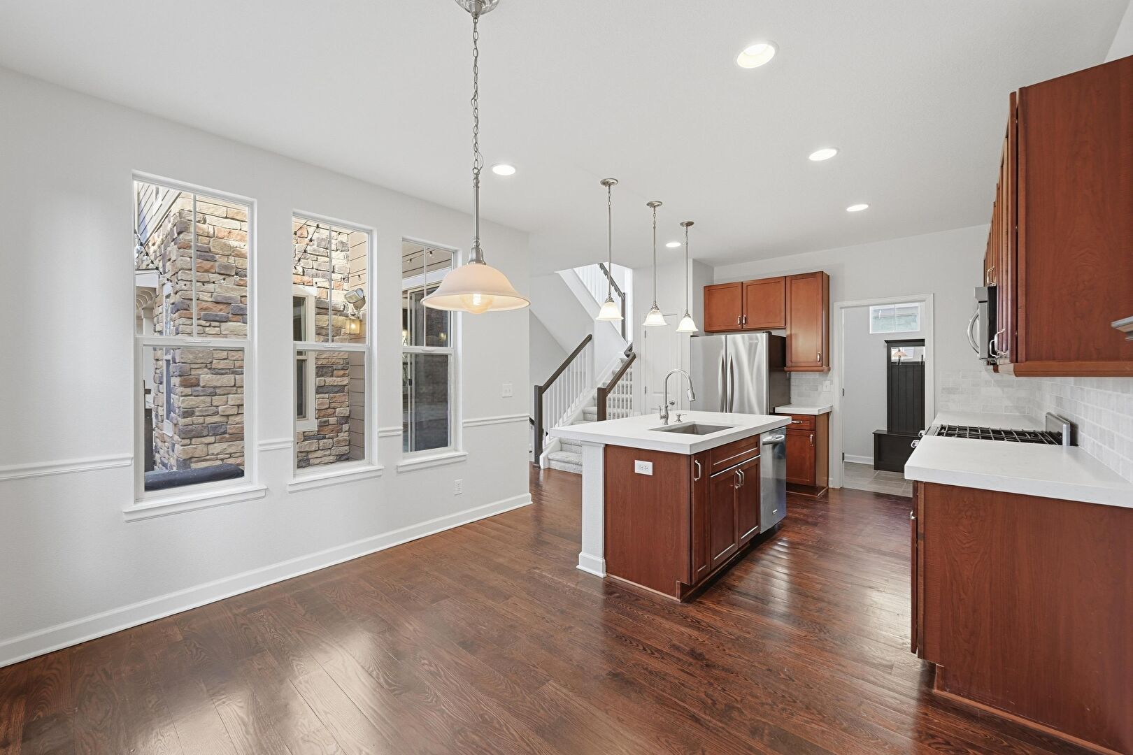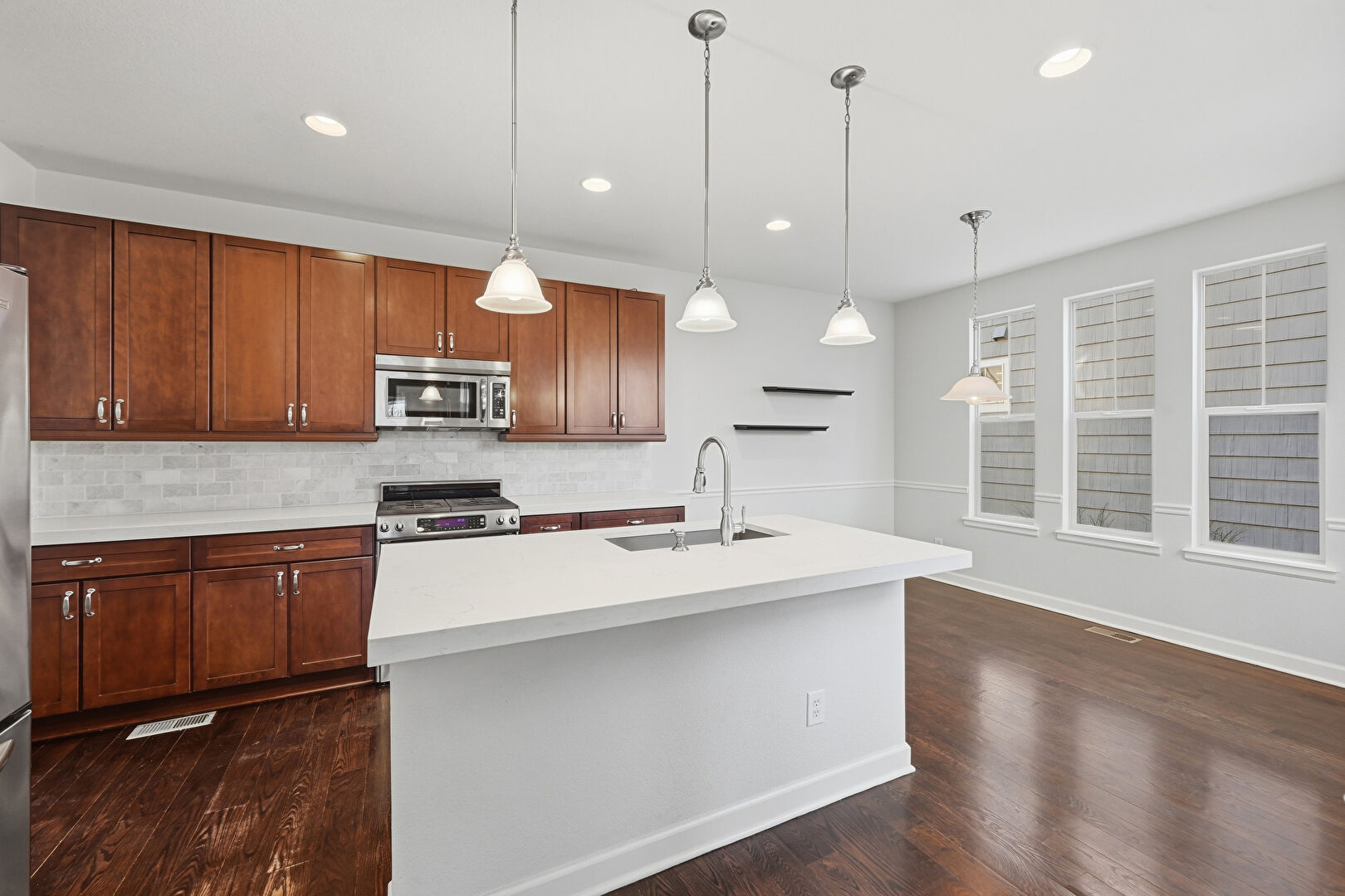 Baseboards Wall, Dark Brown Cabinets, Drywall, Kitchen Bar, Kitchen Island, L Shaped Kitchen, Medium Brown Cabinets, Natural Light, Open Shelves, Pendant Lighting, Recessed Lighting, Shaker Cabinets, Stone Countertops, Vent, Wood Finish Floor, Kitchen Island, Medium Brown Cabinets, Shaker Cabinets, Vent