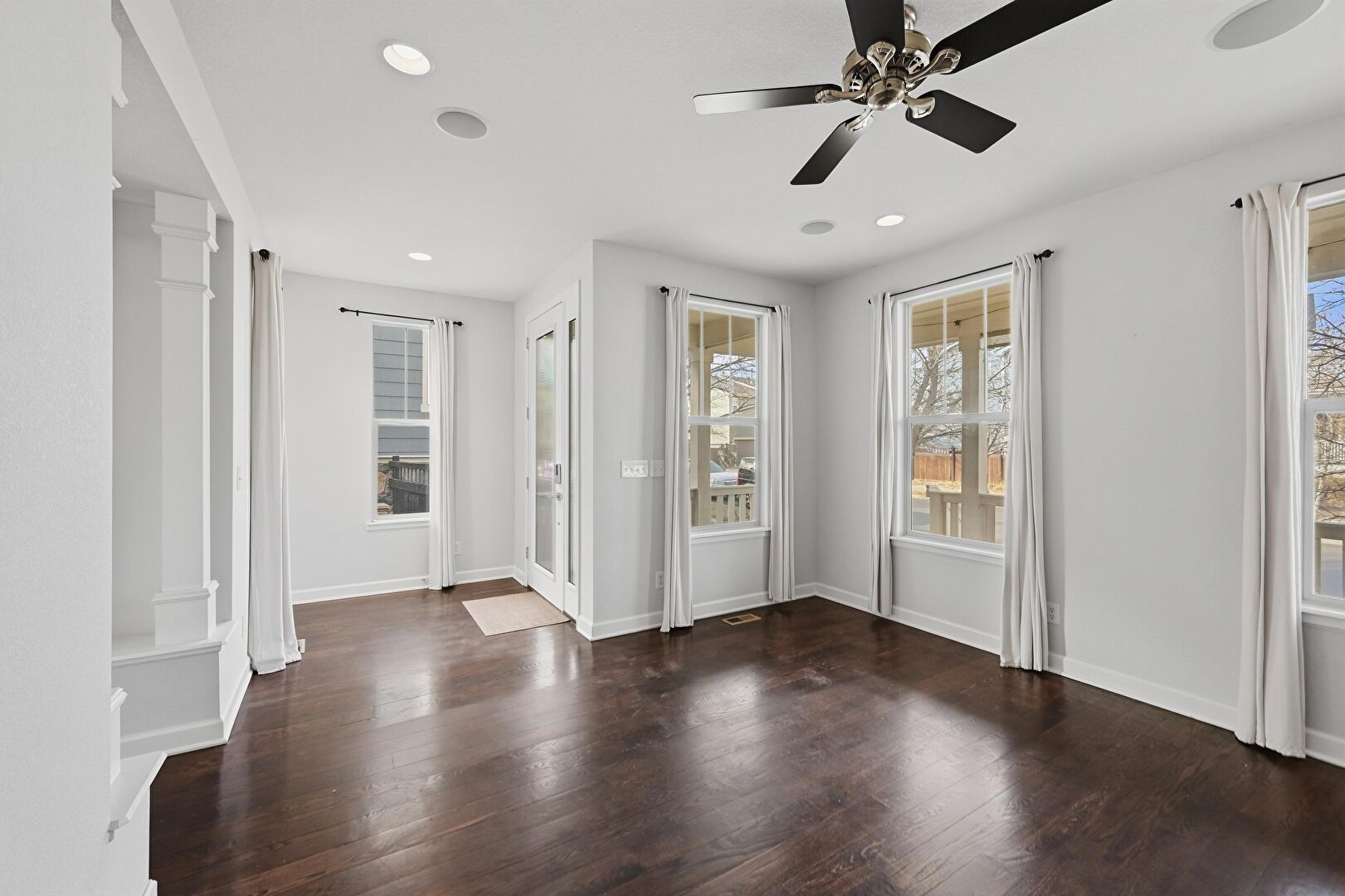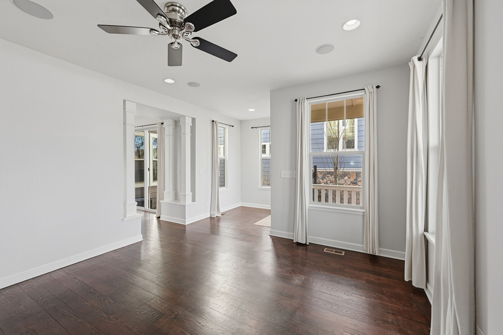Baseboards Wall, Ceiling Fan, Drywall, Natural Light, Recessed Lighting, Wood Finish Floor, Decorative Columns