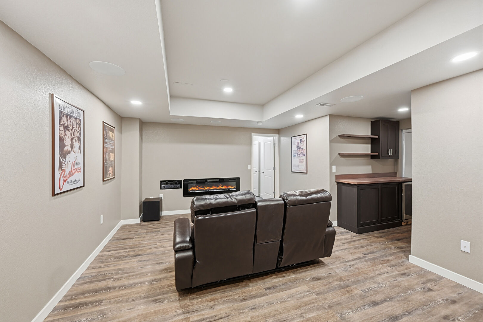 Baseboards Wall, Basement, Drywall, Recessed Lighting, Tray Ceiling, Vent, Wood Finish Floor, Fireplace, Tray Ceiling