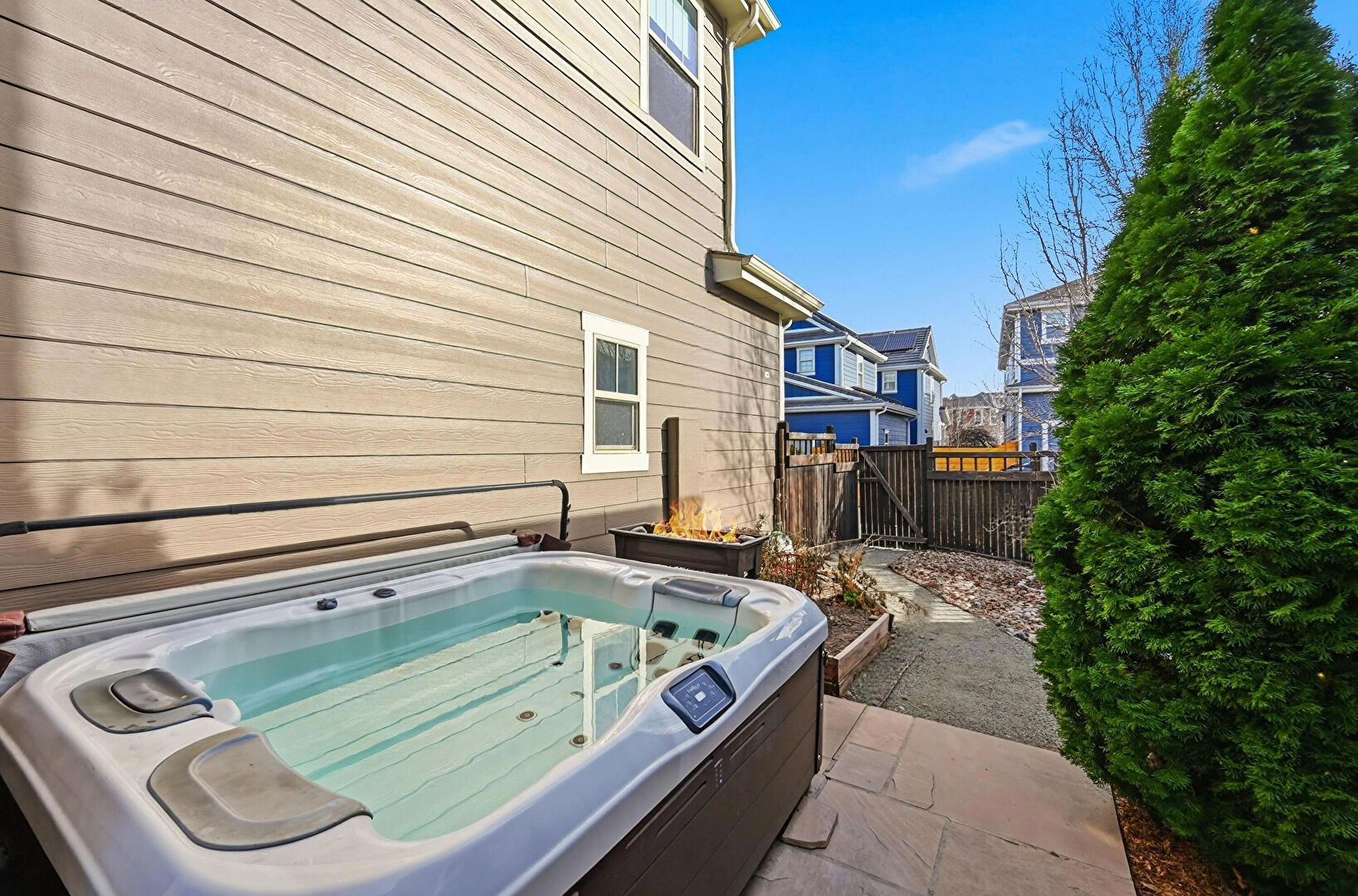 Baseboards Wall, Built In Garage, Butcher Block Countertops, Dark Brown Cabinets, Fence, Patio, Recessed Lighting, Shaker Cabinets, Textured Wall, Wood Finish Floor, Driveway, Hot Tub, Open Shelves