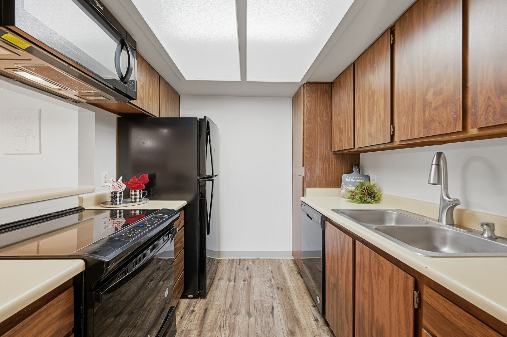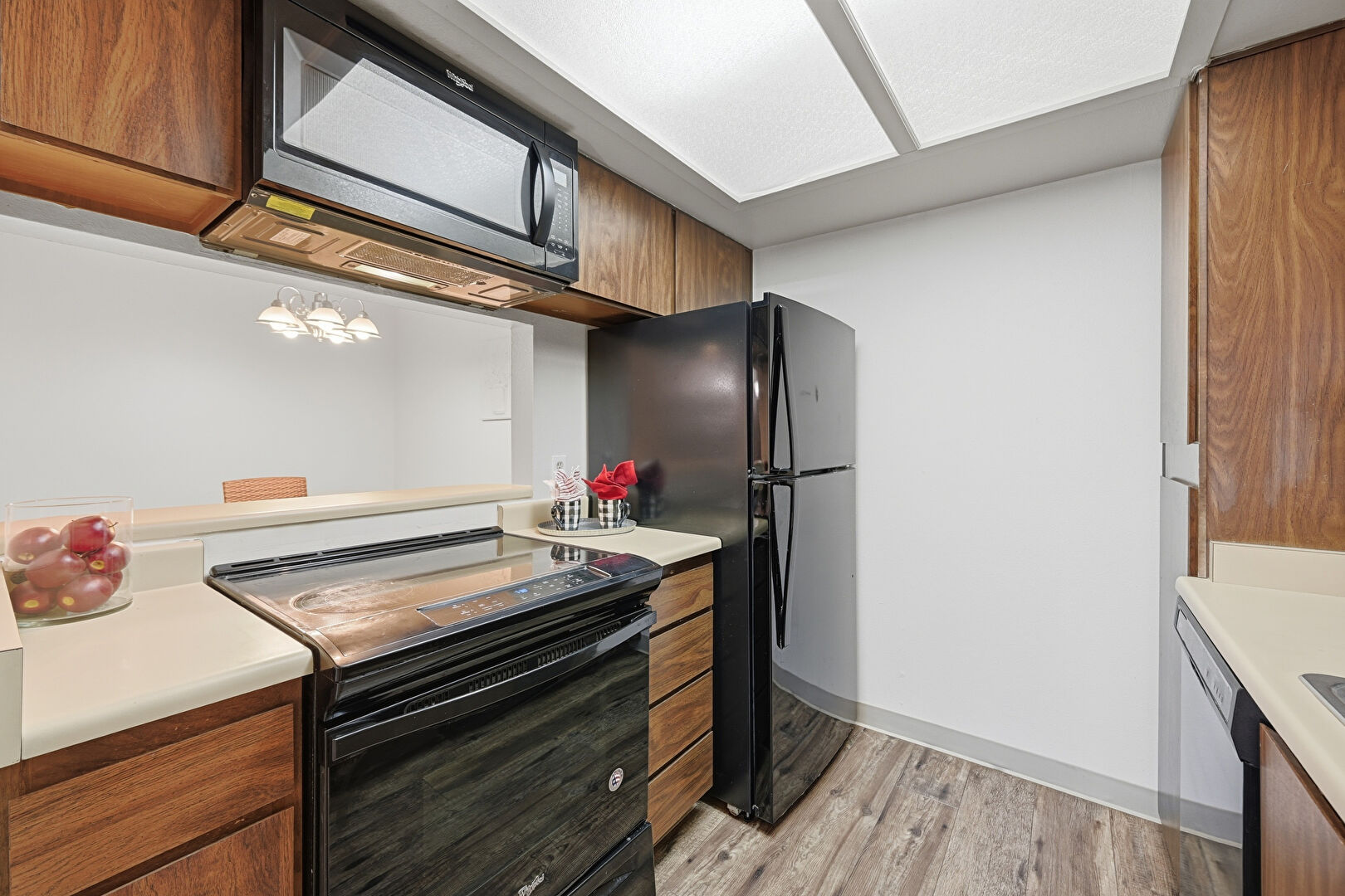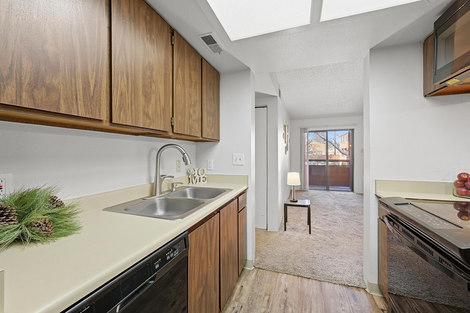 Baseboards Wall, Drywall, Flat Panel Cabinets, Medium Brown Cabinets, Natural Light, Pass Through Window, Skylight, Textured Ceiling, Vent, Visible Hinge Cabinets, Wood Finish Floor, Baseboards Wall, Medium Brown Cabinets