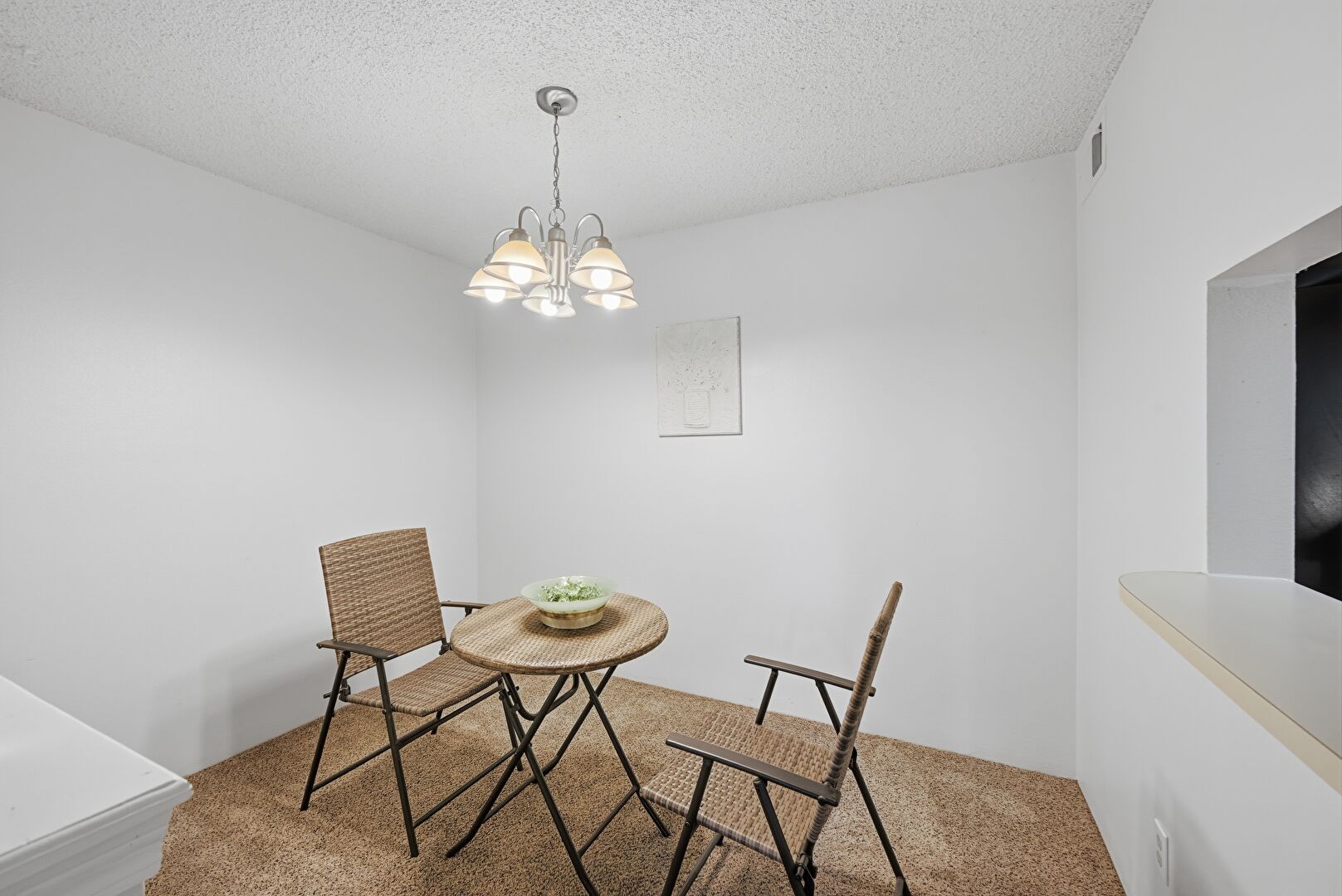 Carpet, Drywall, Natural Light, Notable Chandelier, Textured Ceiling, Vent, Carpet, Drywall