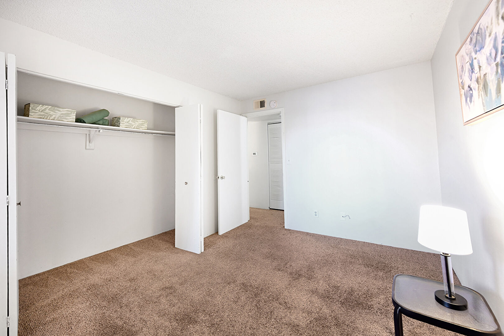 Carpet, Textured Ceiling, Vent, Drywall