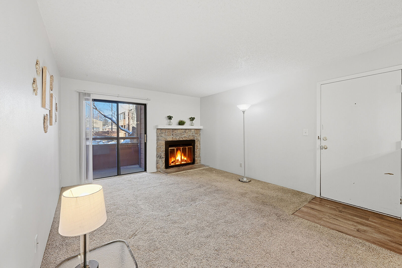 Carpet, Drywall, Natural Light, Notable Chandelier, Textured Ceiling, Vent, Wood Finish Floor, Carpet, Fireplace