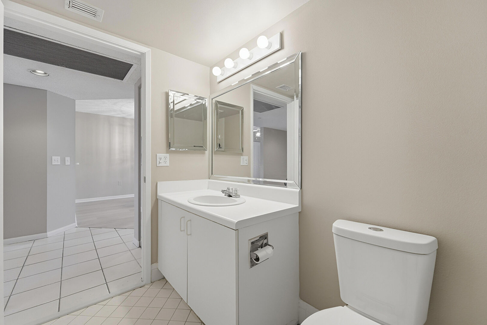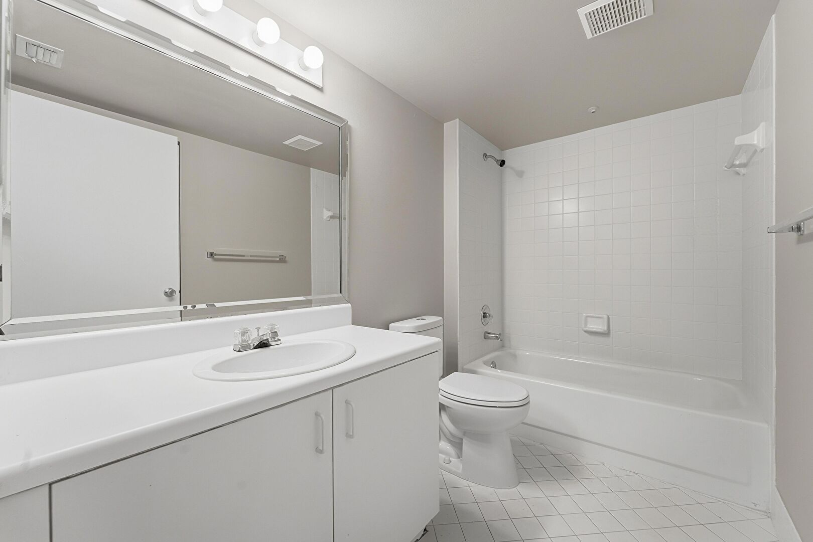 Baseboards Wall, Combined Bath Shower, Drywall, Full Bathroom, Half Bathroom, Tile Floor, Vent, Vanity