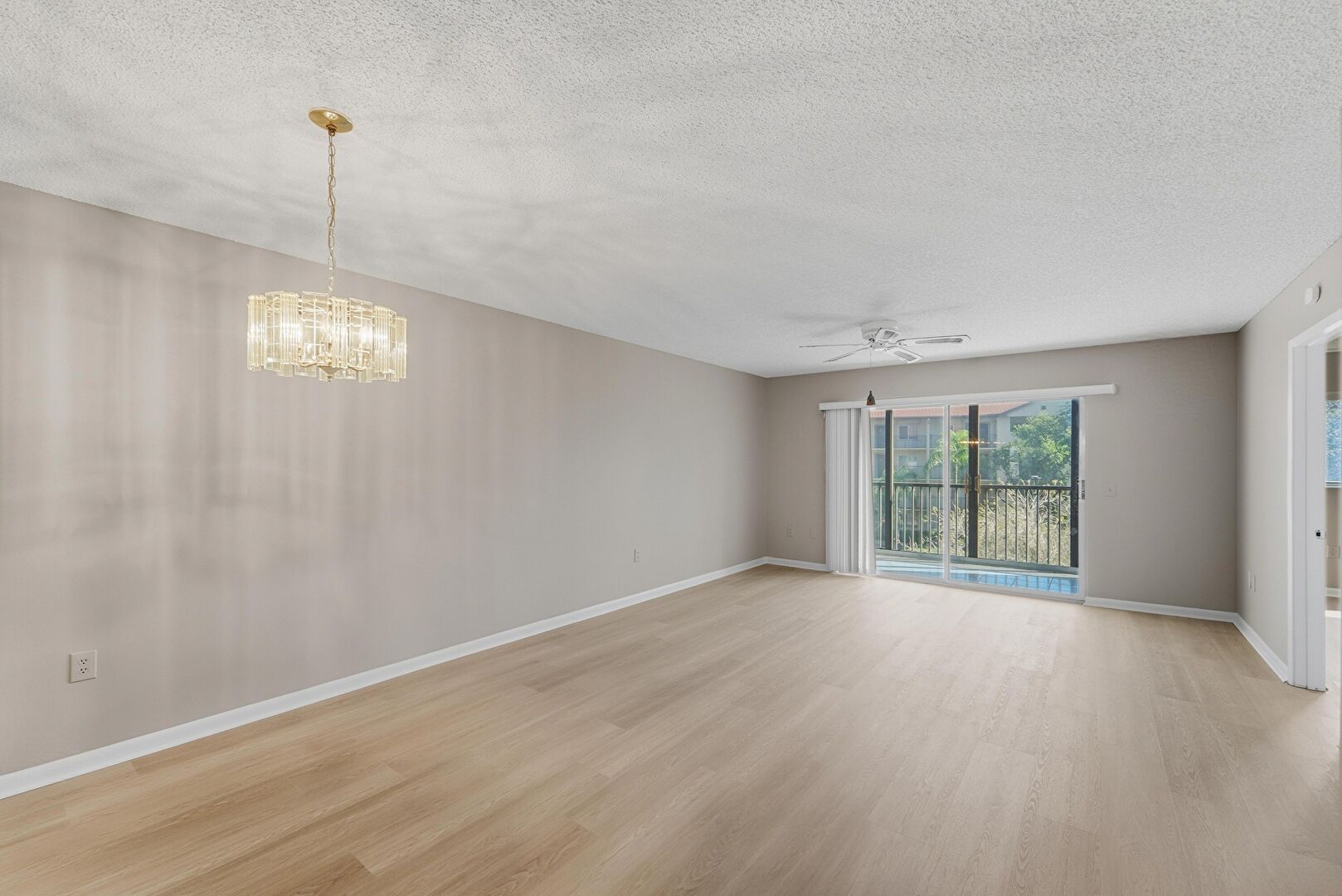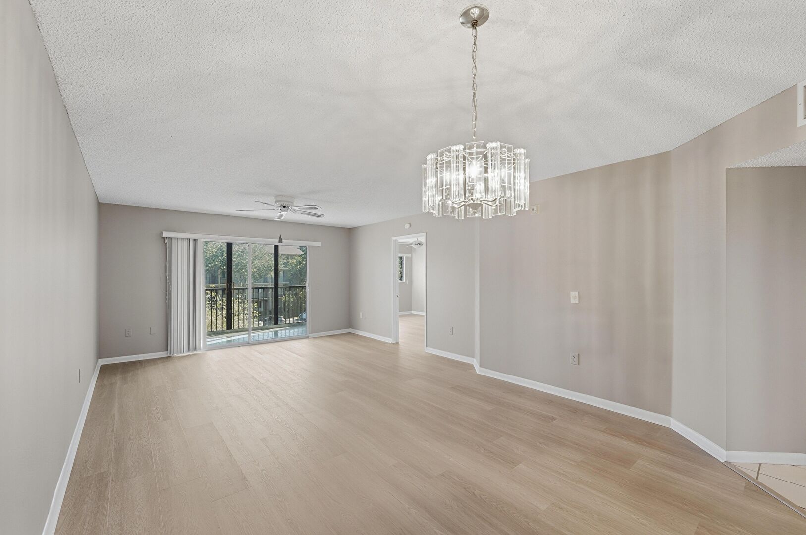 Baseboards Wall, Ceiling Fan, Drywall, Natural Light, Notable Chandelier, Textured Ceiling, Vent, Wood Finish Floor, Drywall, Textured Ceiling