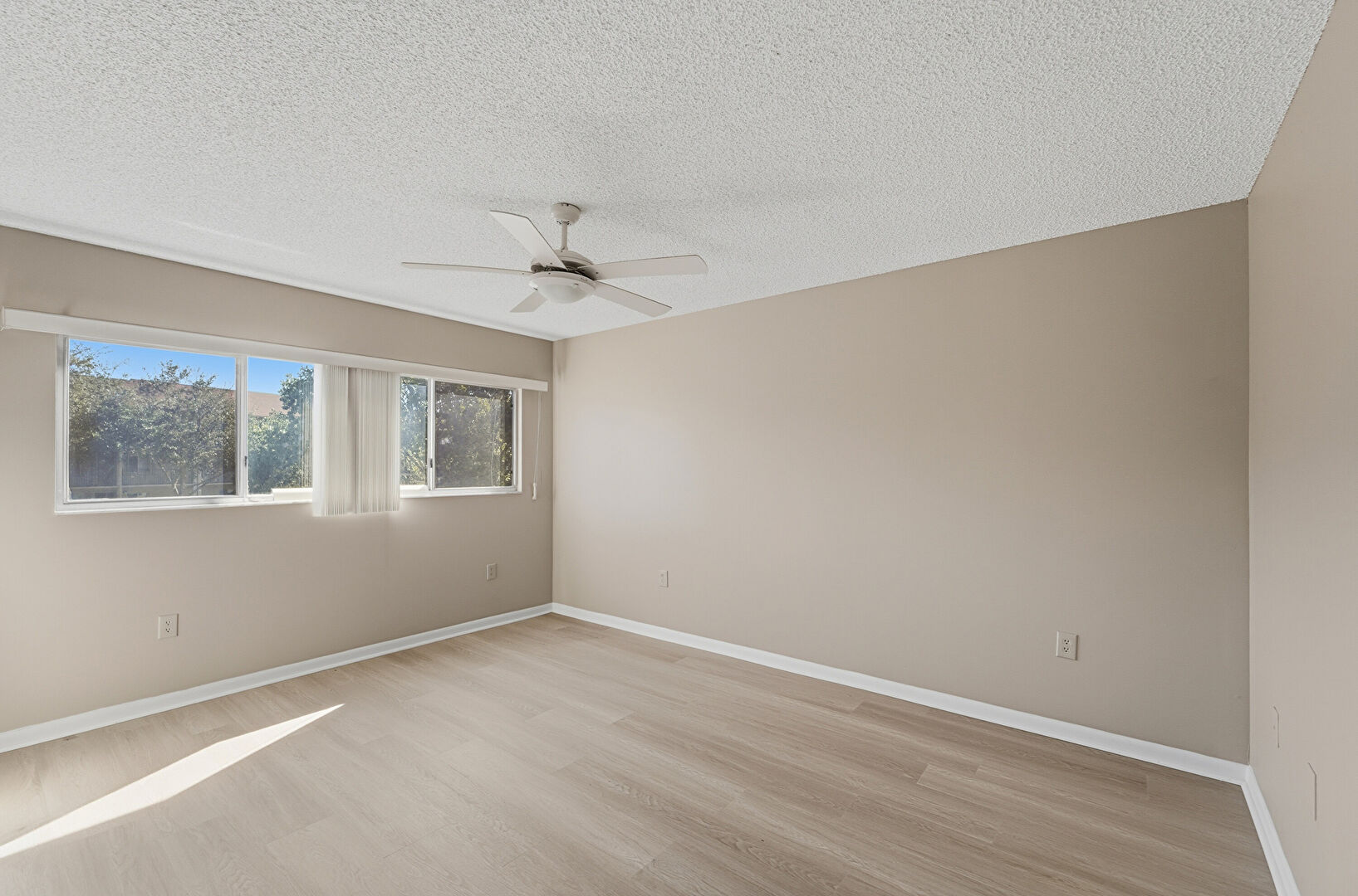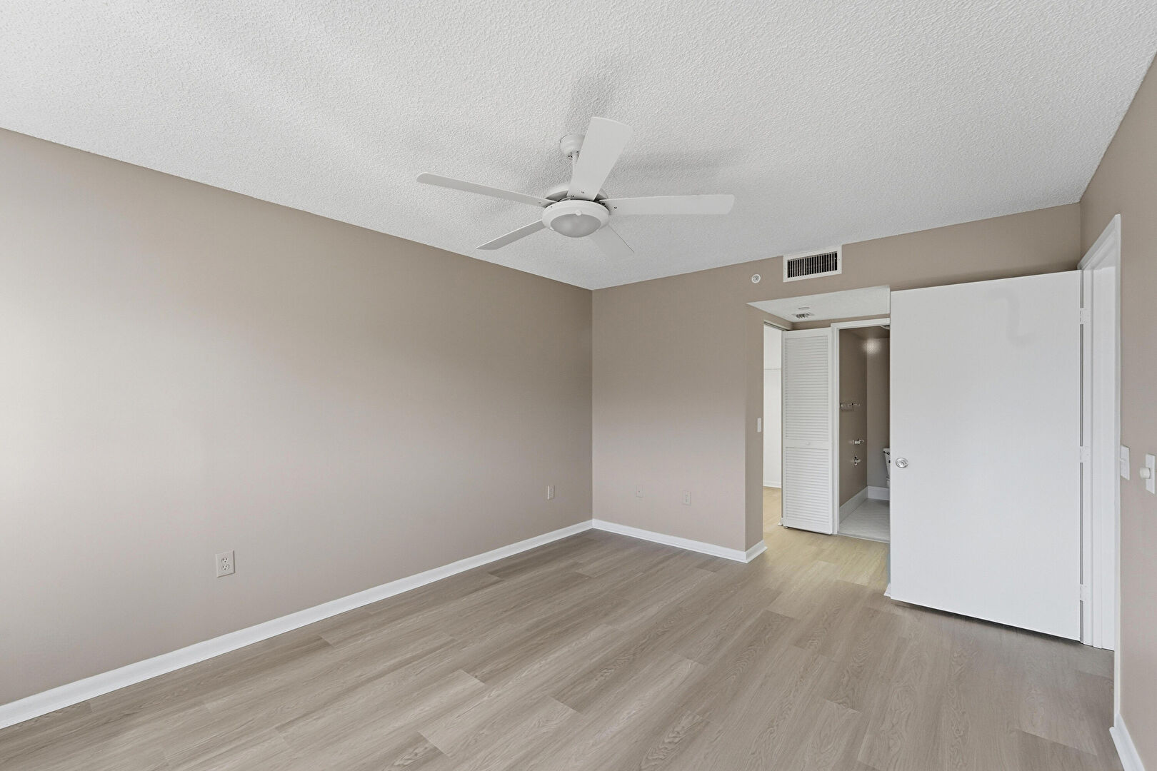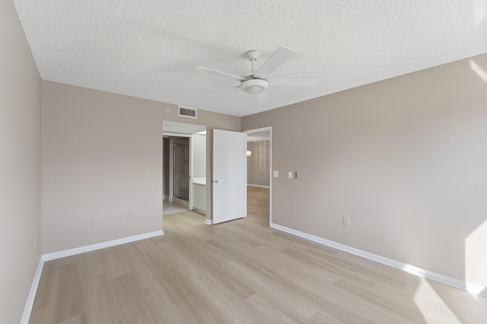 Baseboards Wall, Ceiling Fan, Drywall, Ensuite Bathroom, Natural Light, Textured Ceiling, Vent, Wood Finish Floor, Baseboards Wall, Drywall, Wood Finish Floor
