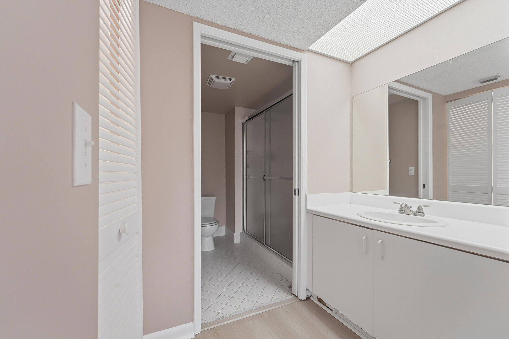 Baseboards Wall, Drywall, Full Bathroom, Textured Ceiling, Tile Floor, Vanity, Vent, Wood Finish Floor, Closet, Drywall