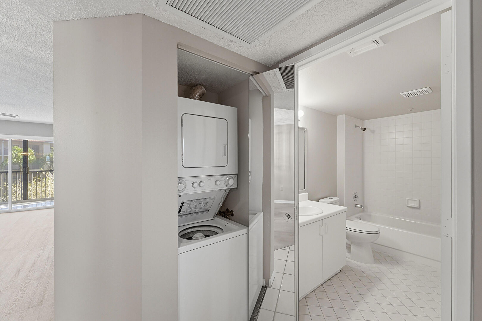 Drywall, Laundry, Natural Light, Textured Ceiling, Vent, Tile Floor