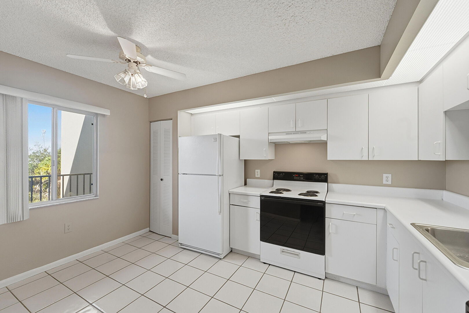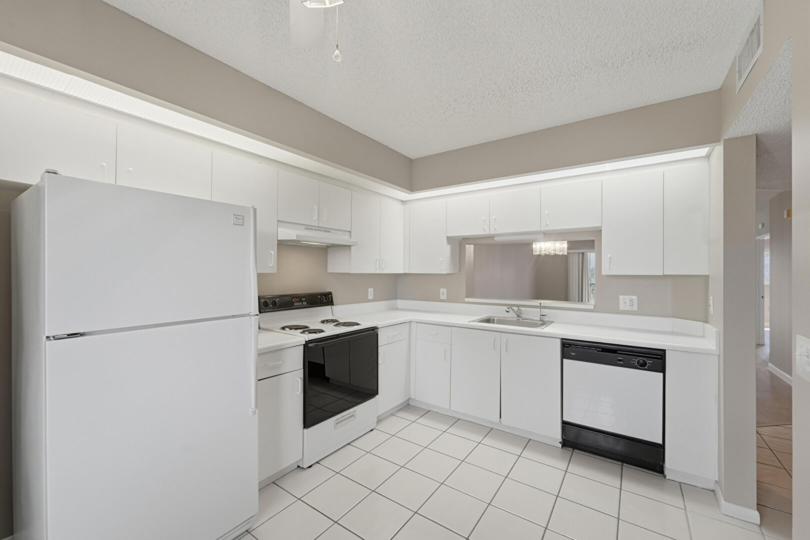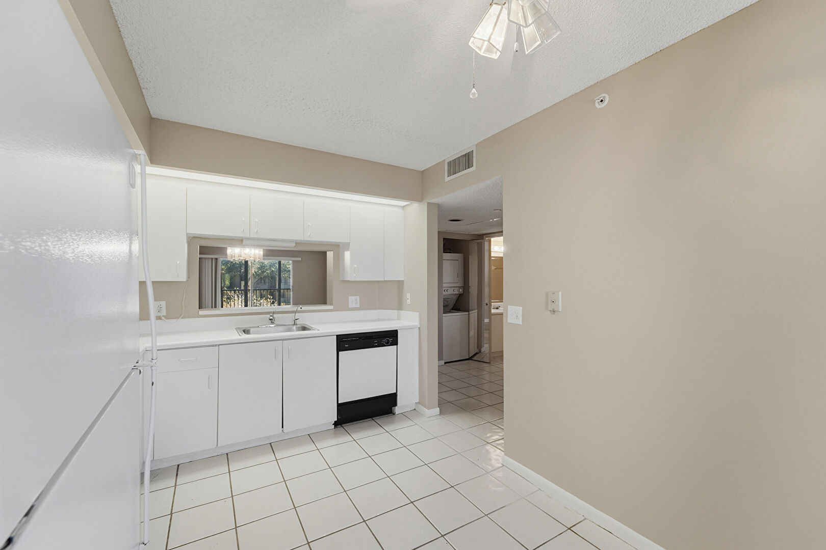 Baseboards Wall, Ceiling Fan, Drywall, L Shaped Kitchen, Laundry, Natural Light, Pass Through Window, Textured Ceiling, Tile Floor, Vent, Washer Dryer, Ceiling Fan, Pass Through Window, Tile Floor