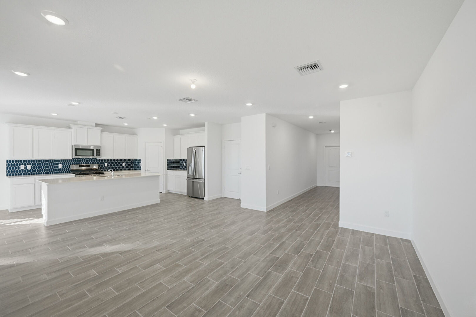Baseboards Wall, Crown Molding Cabinets, Drywall, Kitchen Bar, Kitchen Island, L Shaped Kitchen, Natural Light, Opens To Living Area, Recessed Lighting, Shaker Cabinets, Stone Countertops, Vent, Wood Finish Floor, Baseboards Wall, Drywall