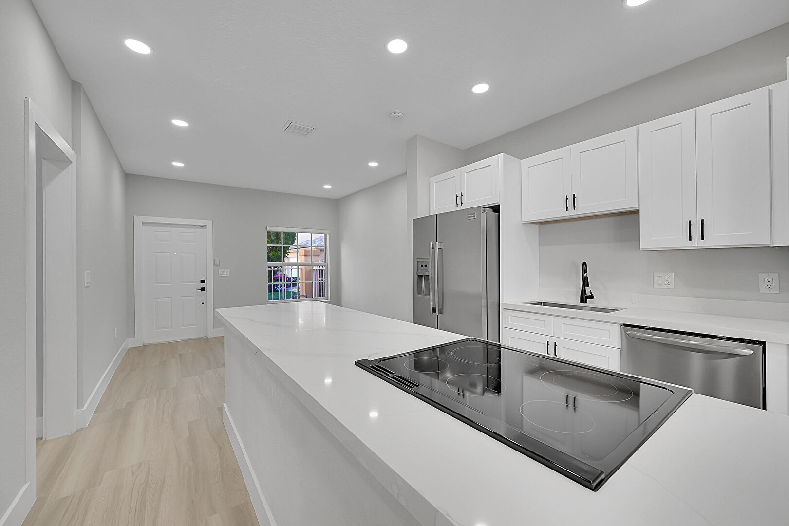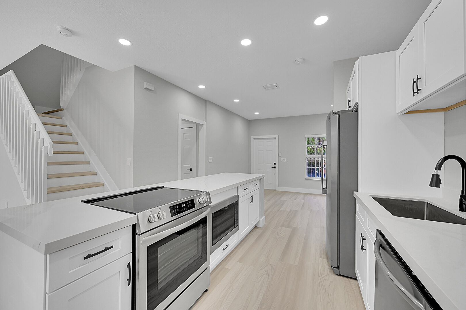 Baseboards Wall, Drywall, Galley Kitchen, Kitchen Bar, Kitchen Peninsula, Natural Light, Opens To Living Area, Recessed Lighting, Shaker Cabinets, Stone Countertops, Vent, Wood Finish Floor, Baseboards Wall, Natural Light
