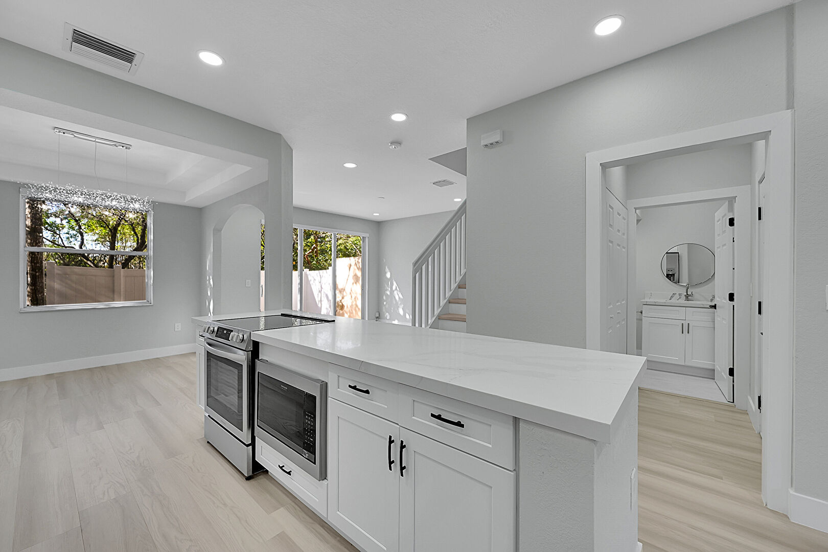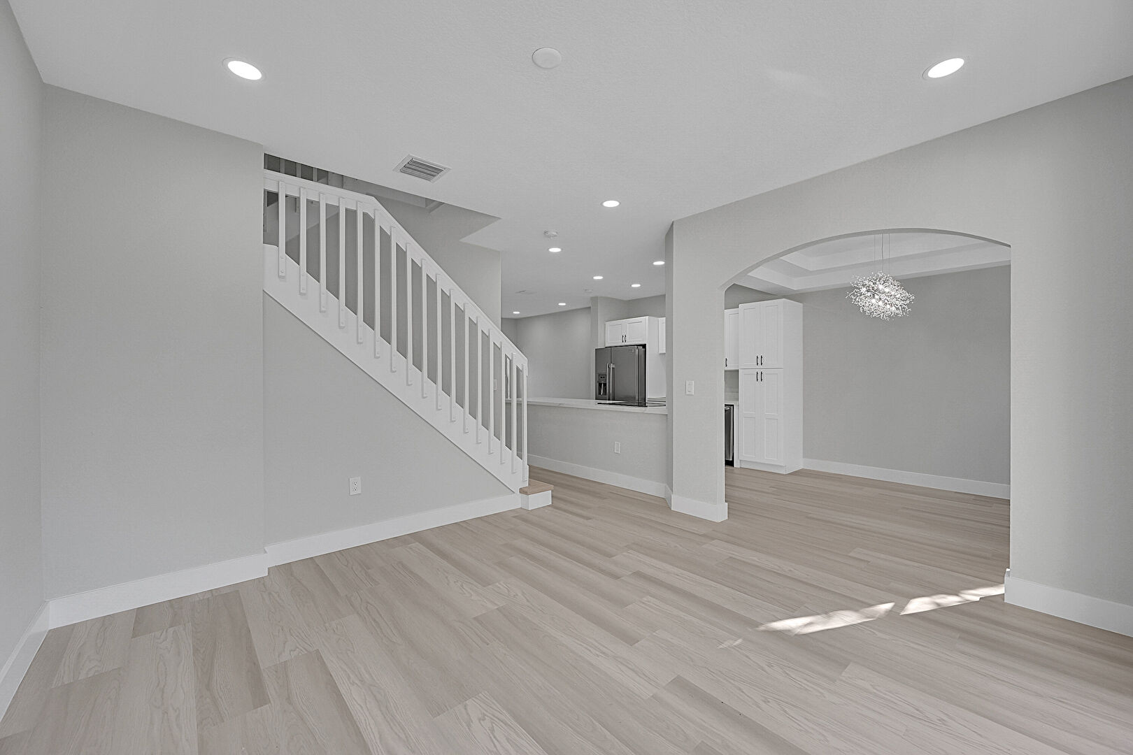 Arched Walkways, Baseboards Wall, Drywall, Natural Light, Notable Chandelier, Recessed Lighting, Stairs, Vent, Wood Finish Floor, Drywall, Smoke Carbon Monoxide Detector, Stairs, Vent