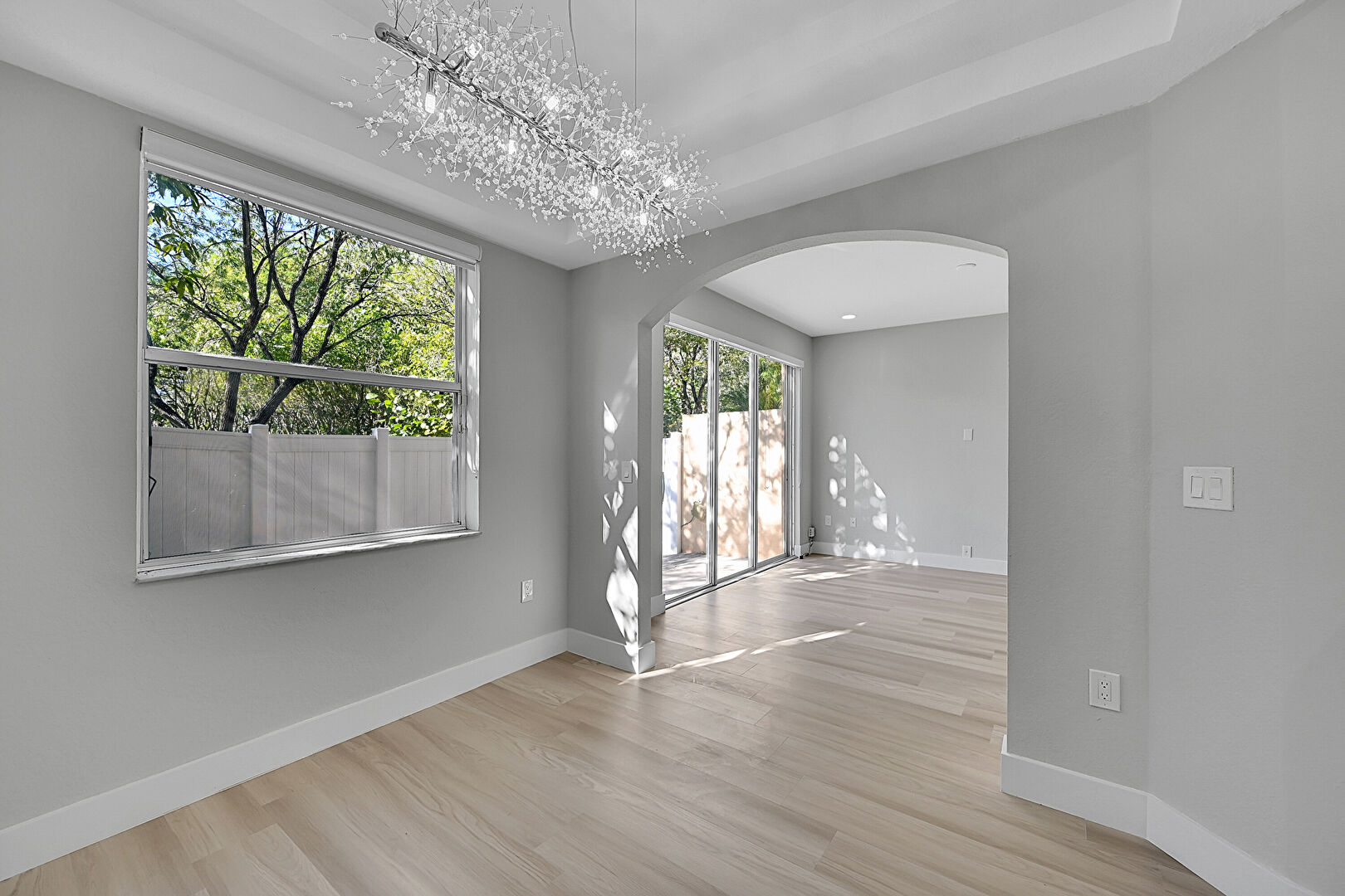 Arched Walkways, Baseboards Wall, Drywall, Natural Light, Notable Chandelier, Opens To Living Area, Pendant Lighting, Recessed Lighting, Shaker Cabinets, Stone Countertops, Tray Ceiling, Wood Finish Floor, Baseboards Wall, Wood Finish Floor