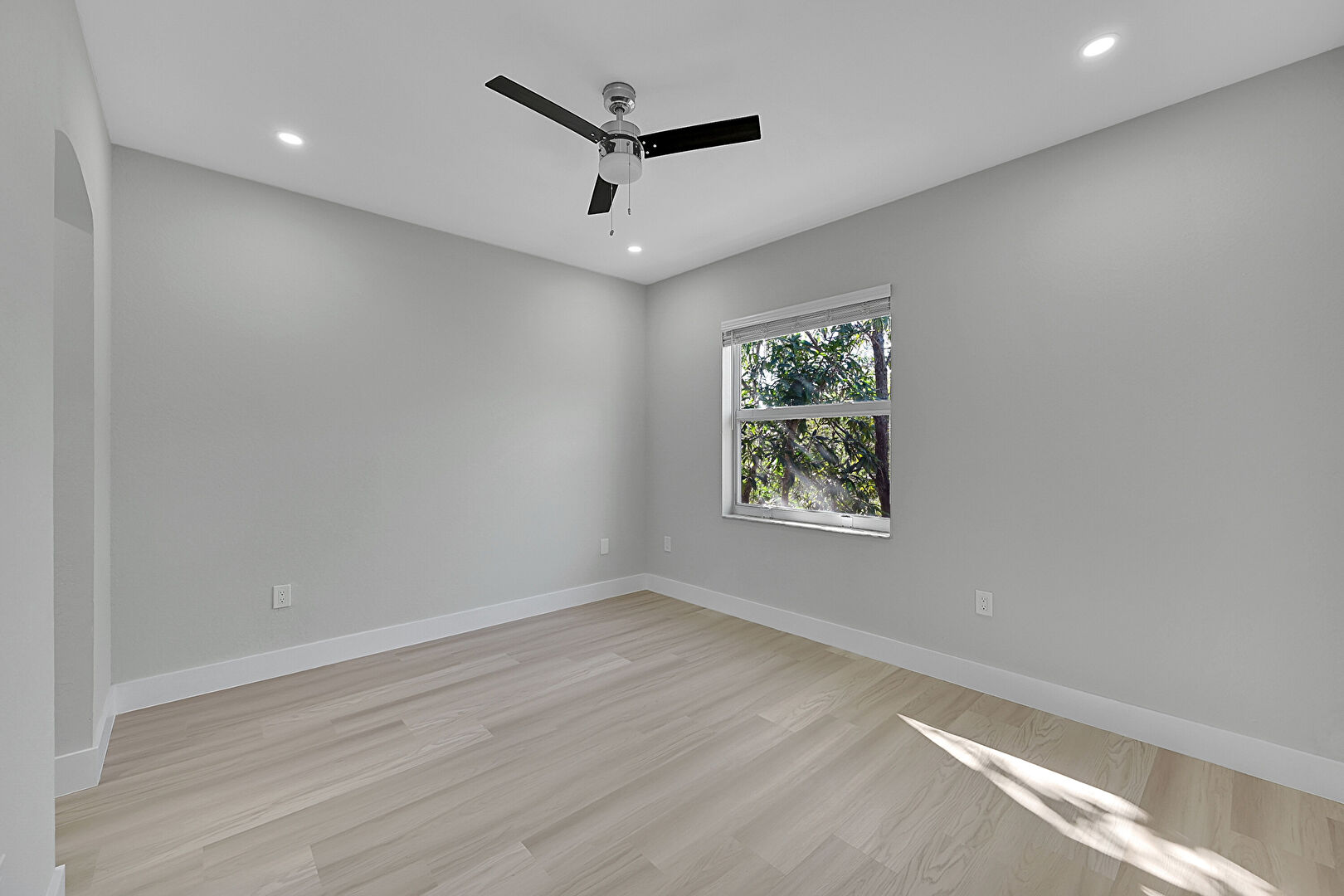 Arched Walkways, Baseboards Wall, Ceiling Fan, Recessed Lighting, Vent, Wood Finish Floor, Drywall