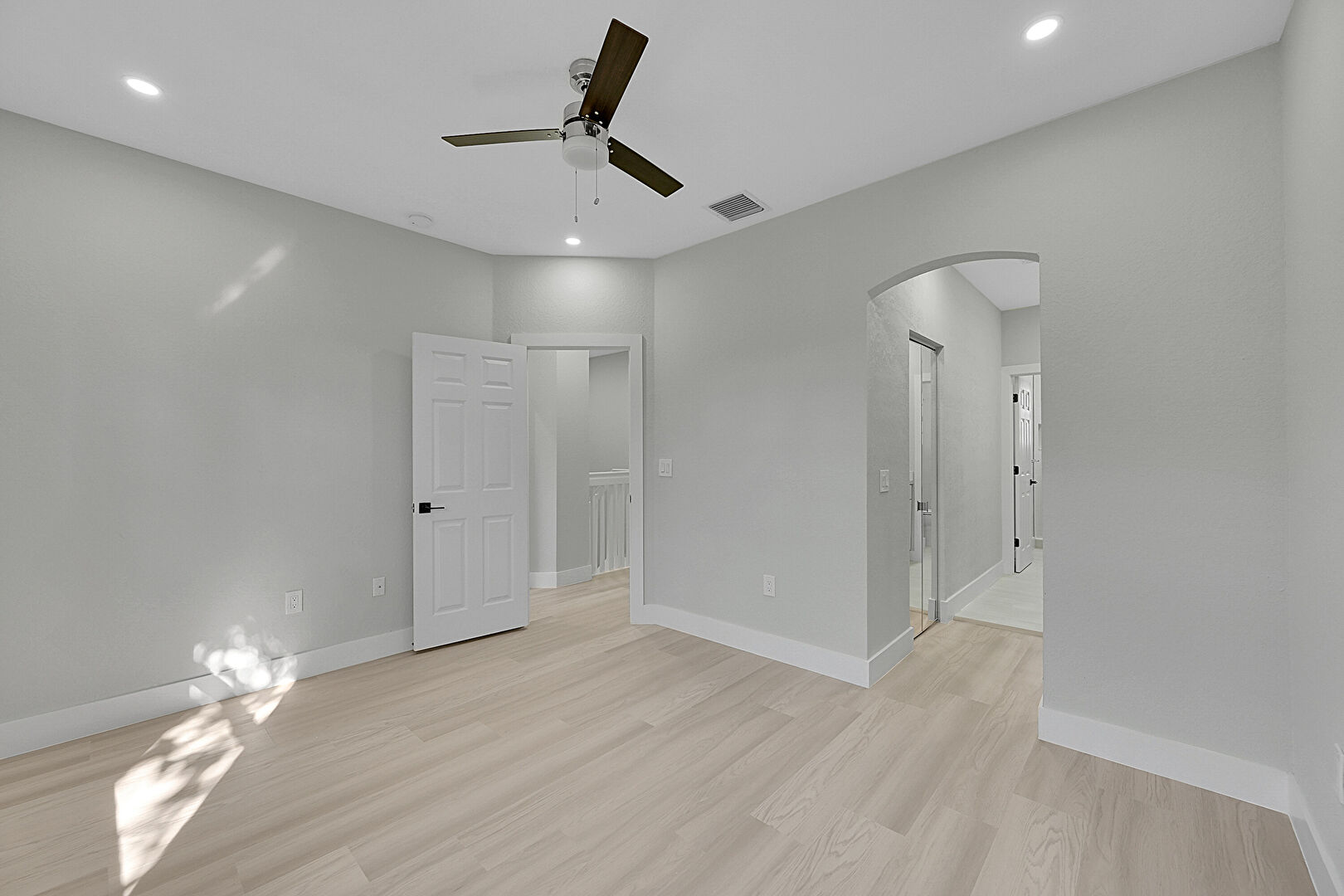 Arched Walkways, Baseboards Wall, Ceiling Fan, Closet, Drywall, Natural Light, Recessed Lighting, Vent, Wood Finish Floor, Baseboards Wall, Drywall, Ensuite Bathroom, Recessed Lighting