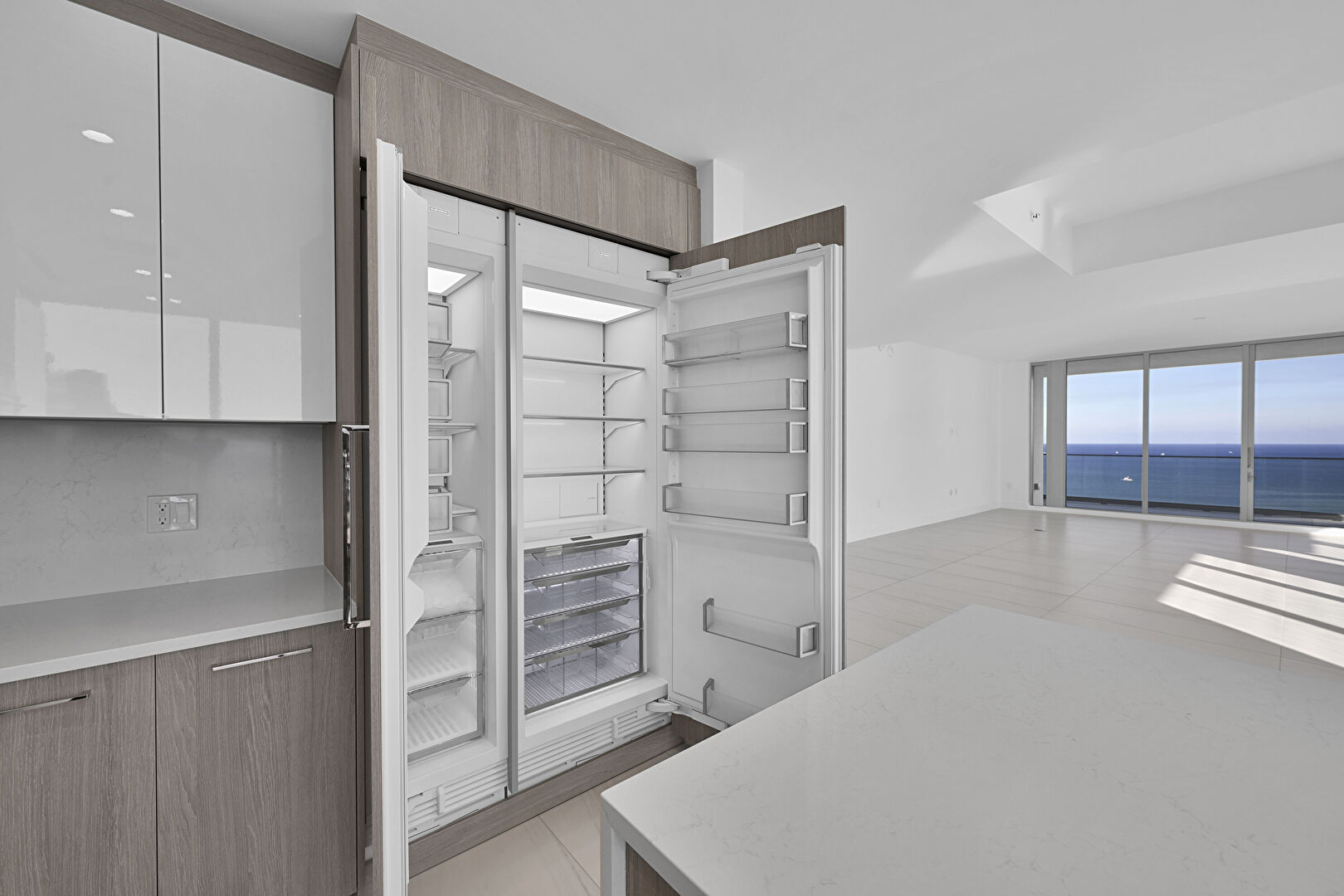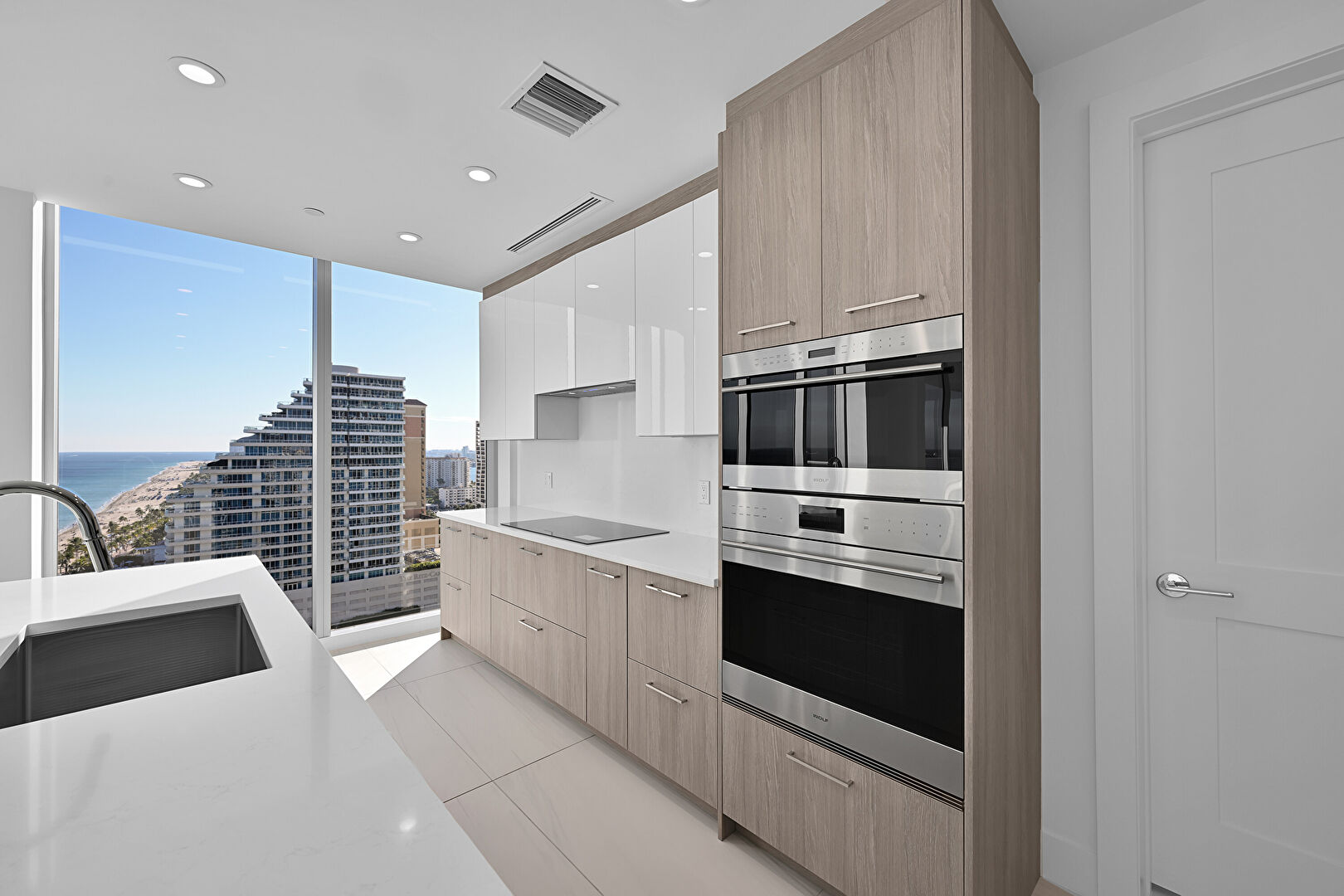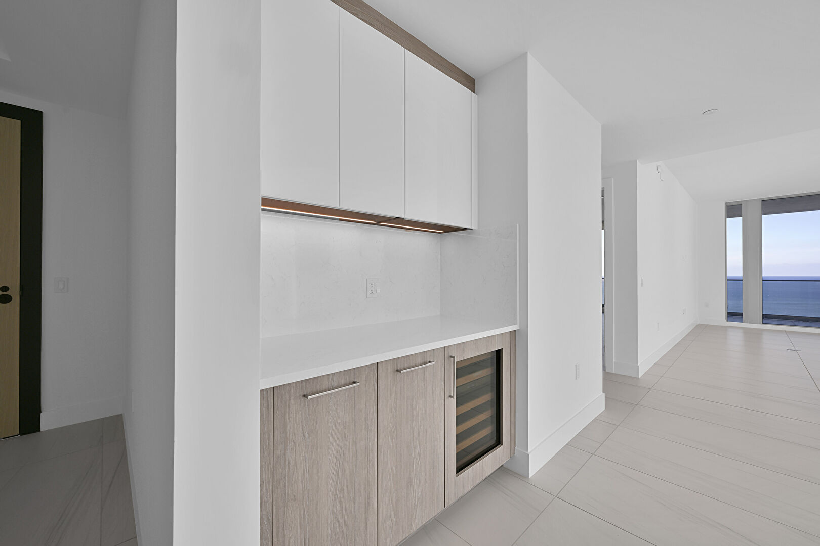 Baseboards Wall, Beach View, City View, Double Oven, Drywall, Flat Panel Cabinets, Floor Ceiling Windows, Indoor Bar, Kitchen Bar, Kitchen Island, L Shaped Kitchen, Marble Finish Floor, Medium Brown Cabinets, Natural Light, One Wall Kitchen, Opens To Living Area, Recessed Lighting, Stone Countertops, Tile Floor, Tray Ceiling, Vent, Water View, Wine Cooler, Baseboards Wall, City View, Double Oven, Drywall, Flat Panel Cabinets, Medium Brown Cabinets, Recessed Lighting, Vent