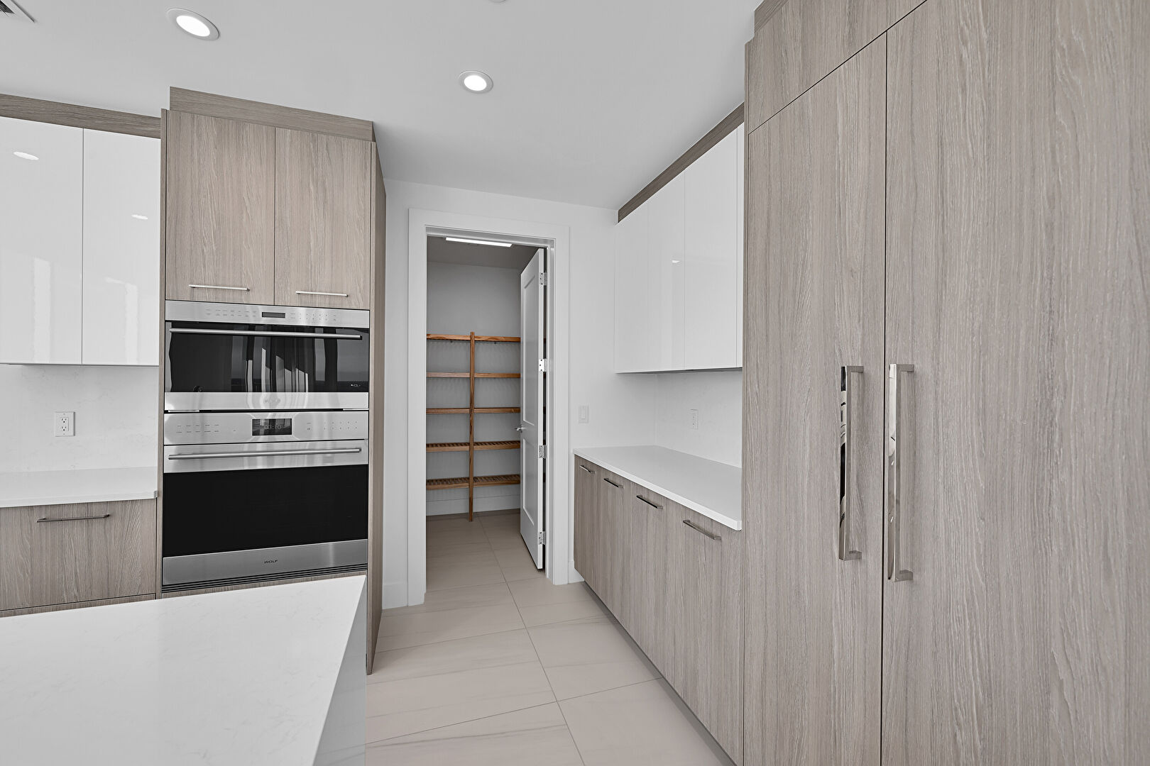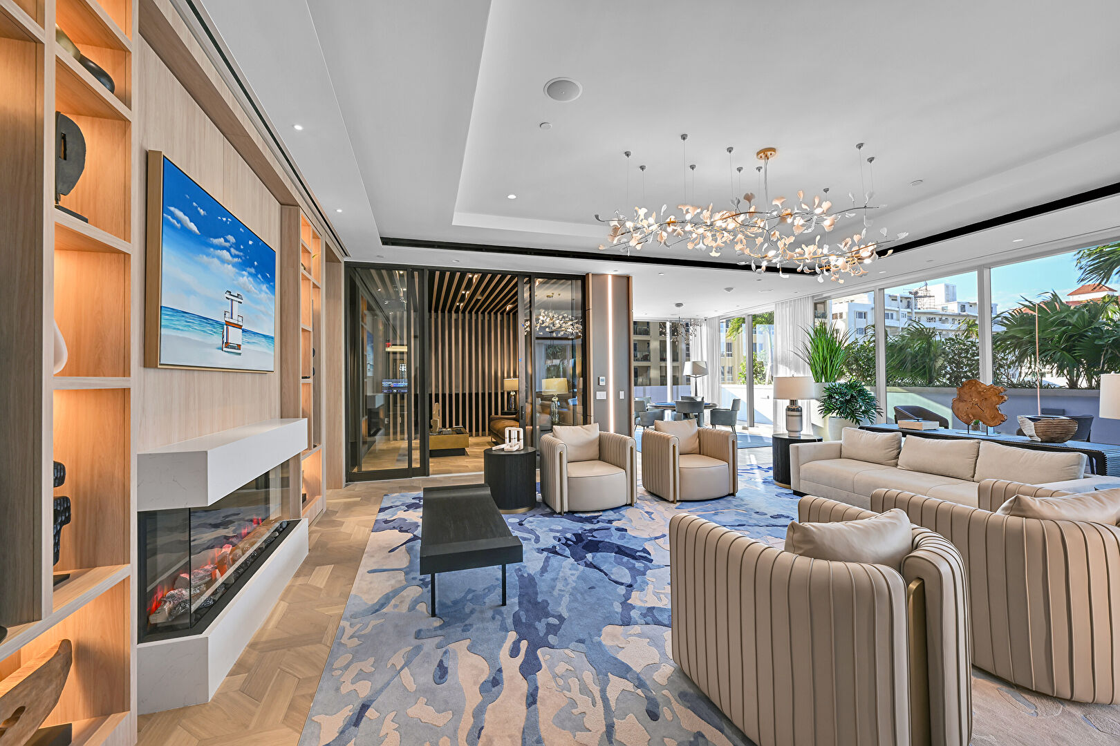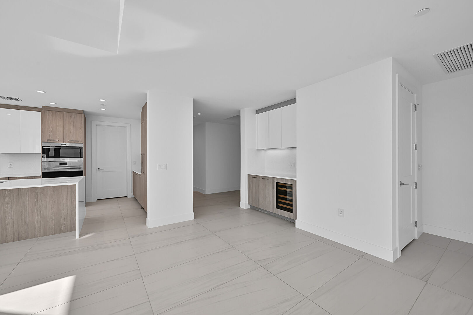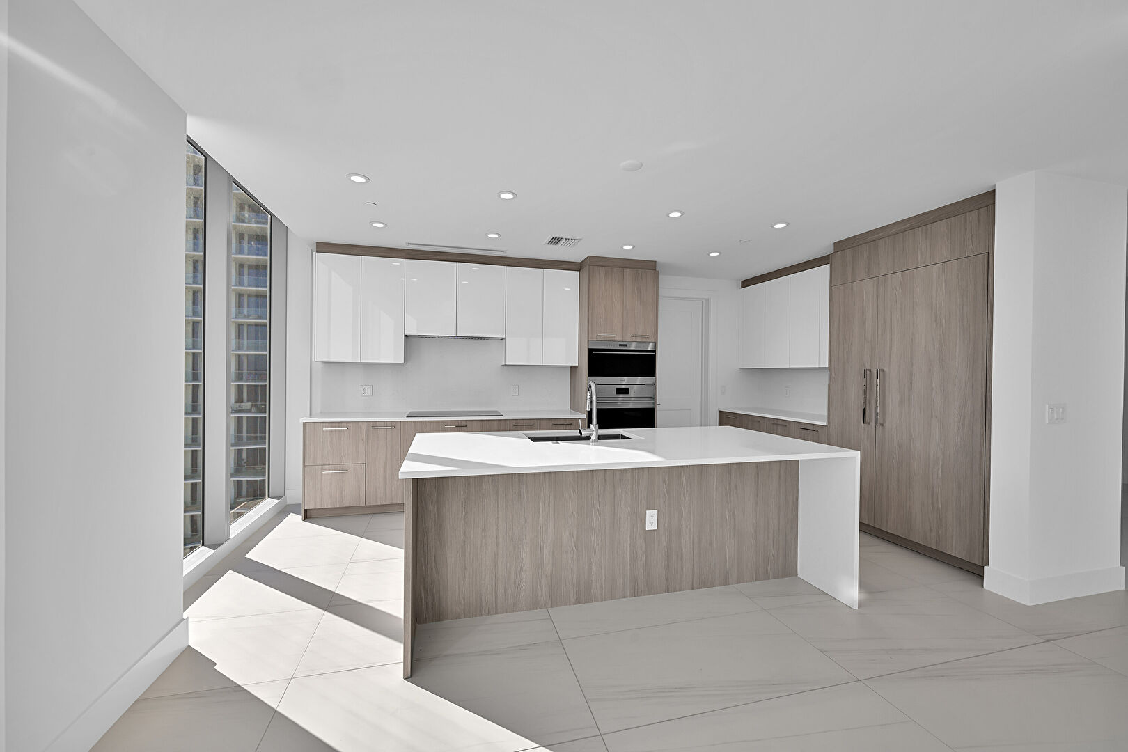 Baseboards Wall, Beach View, City View, Double Oven, Drywall, Flat Panel Cabinets, Floor Ceiling Windows, Indoor Bar, Kitchen Bar, Kitchen Island, L Shaped Kitchen, Marble Finish Floor, Medium Brown Cabinets, Natural Light, One Wall Kitchen, Opens To Living Area, Recessed Lighting, Stone Countertops, Tile Floor, Tray Ceiling, Vent, Water View, Wine Cooler, Baseboards Wall, City View, Double Oven, Drywall, Flat Panel Cabinets, Medium Brown Cabinets, Recessed Lighting, Vent