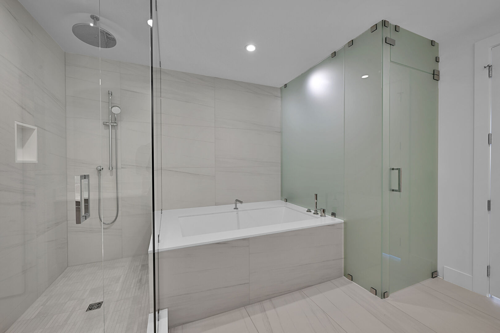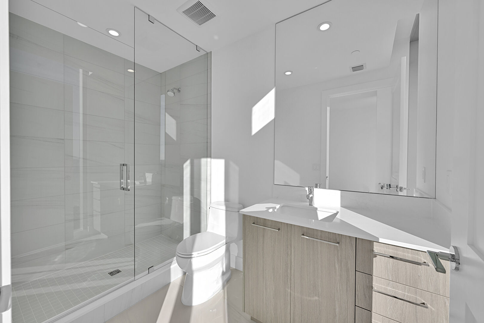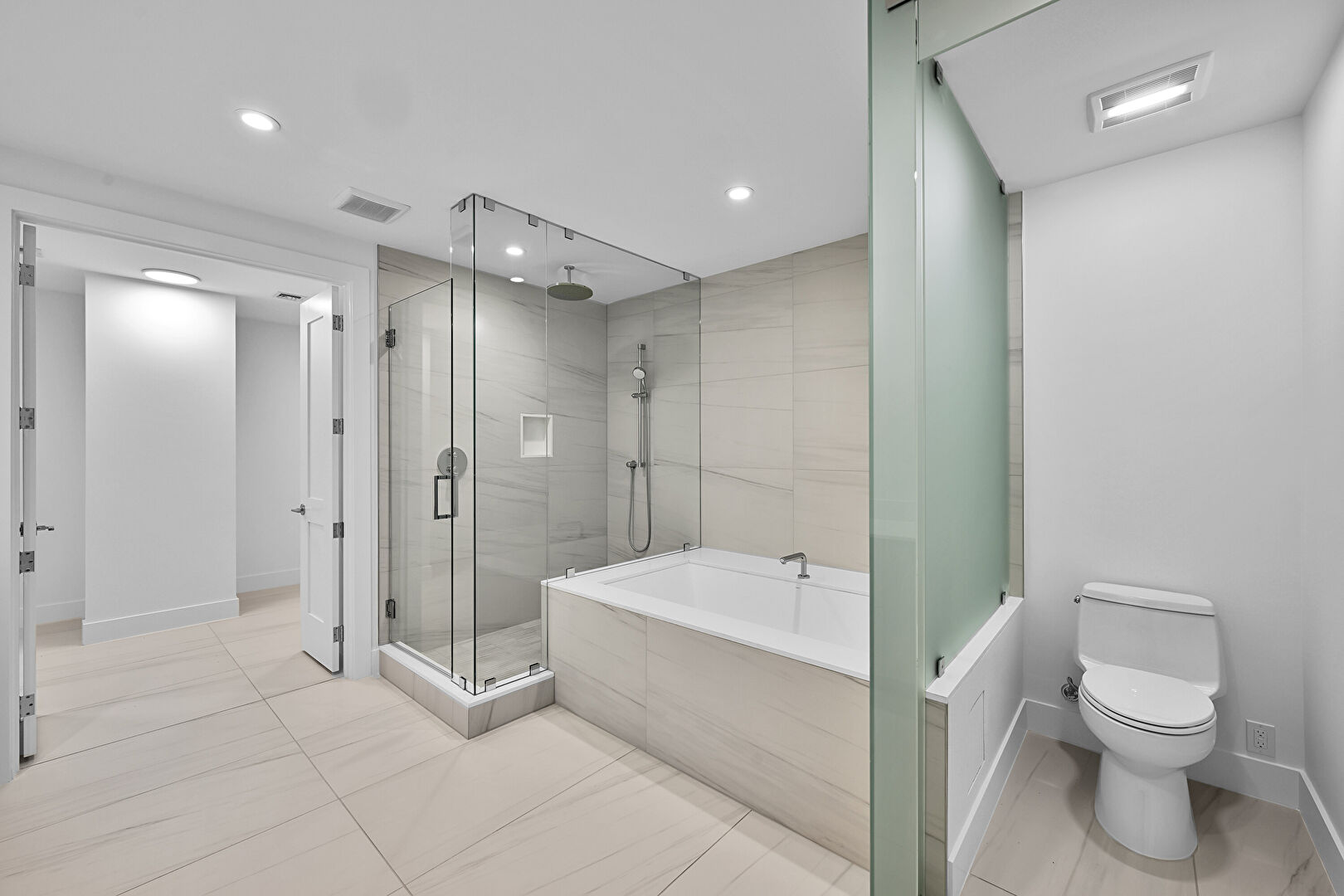 Baseboards Wall, City View, Double Vanity, Drywall, Full Bathroom, Half Bathroom, Natural Light, Recessed Lighting, Tile Floor, Vanity, Vent, Walk In Closet, Baseboards Wall, Drywall, Full Bathroom, Recessed Lighting, Vanity, Vent