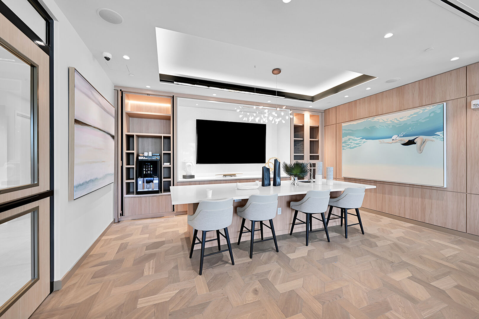 Baseboards Wall, Drywall, Flat Panel Cabinets, Glass Insert Cabinets, Indoor Bar, Natural Light, Recessed Lighting, Security Camera, Stone Countertops, Tile Floor, Wine Cooler, Indoor Bar, Pendant Lighting, Stone Countertops