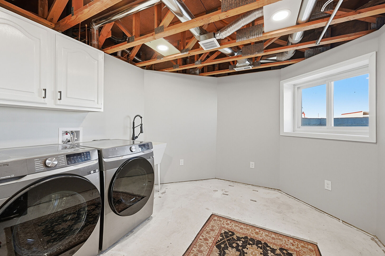 Basement, Concrete Floor, Drywall, Laundry, Vent, Washer Hookup, Natural Light