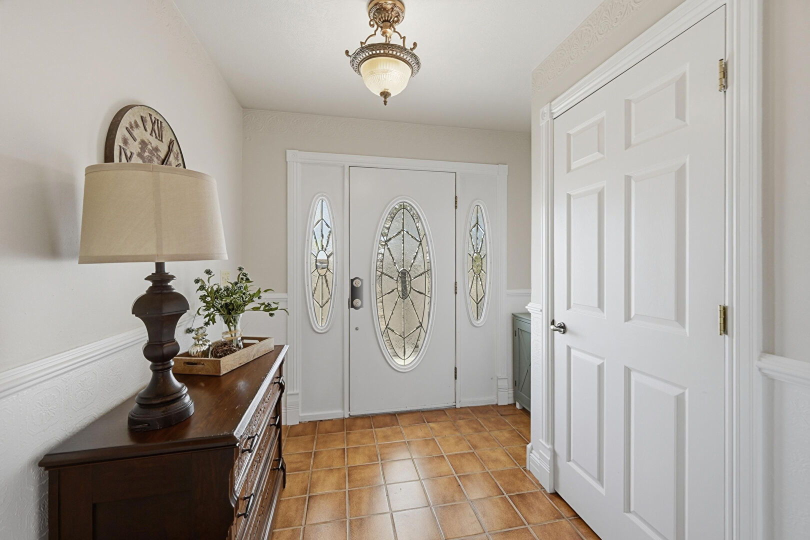 Baseboards Wall, Drywall, Inlaid Floor, Natural Light, Notable Chandelier, Pendant Lighting, Rural View, Tile Floor, Natural Light, Notable Chandelier, Vent