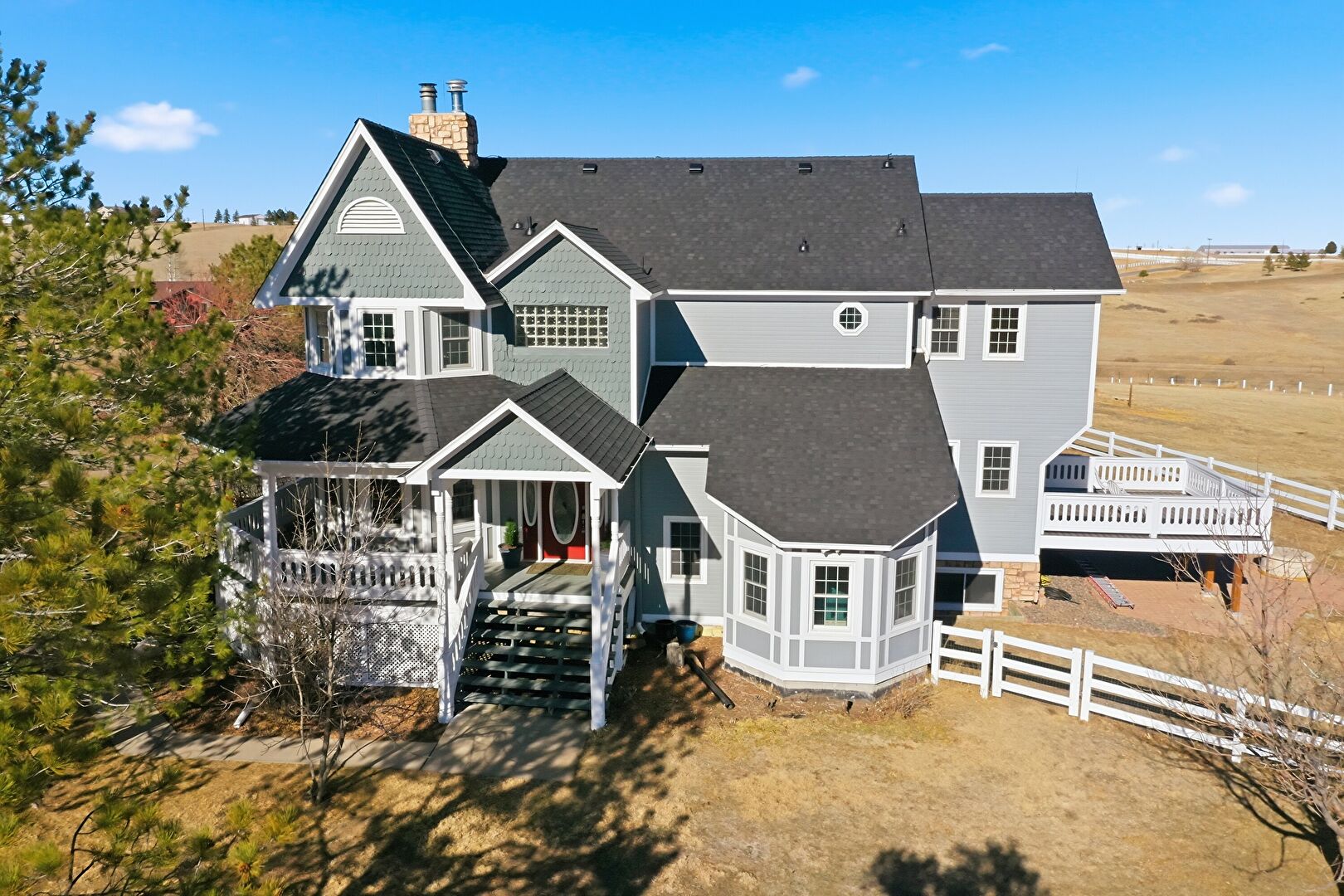 Chimney, Deck, Downspout, Fence, Gutters, Horizontal Siding, Lawn, Patio, Porch, Rural View, Shake Shingle Siding, Shingle Roof, Stairs, Stone Siding, Deck, Fence, Patio, Stairs, Stucco Siding