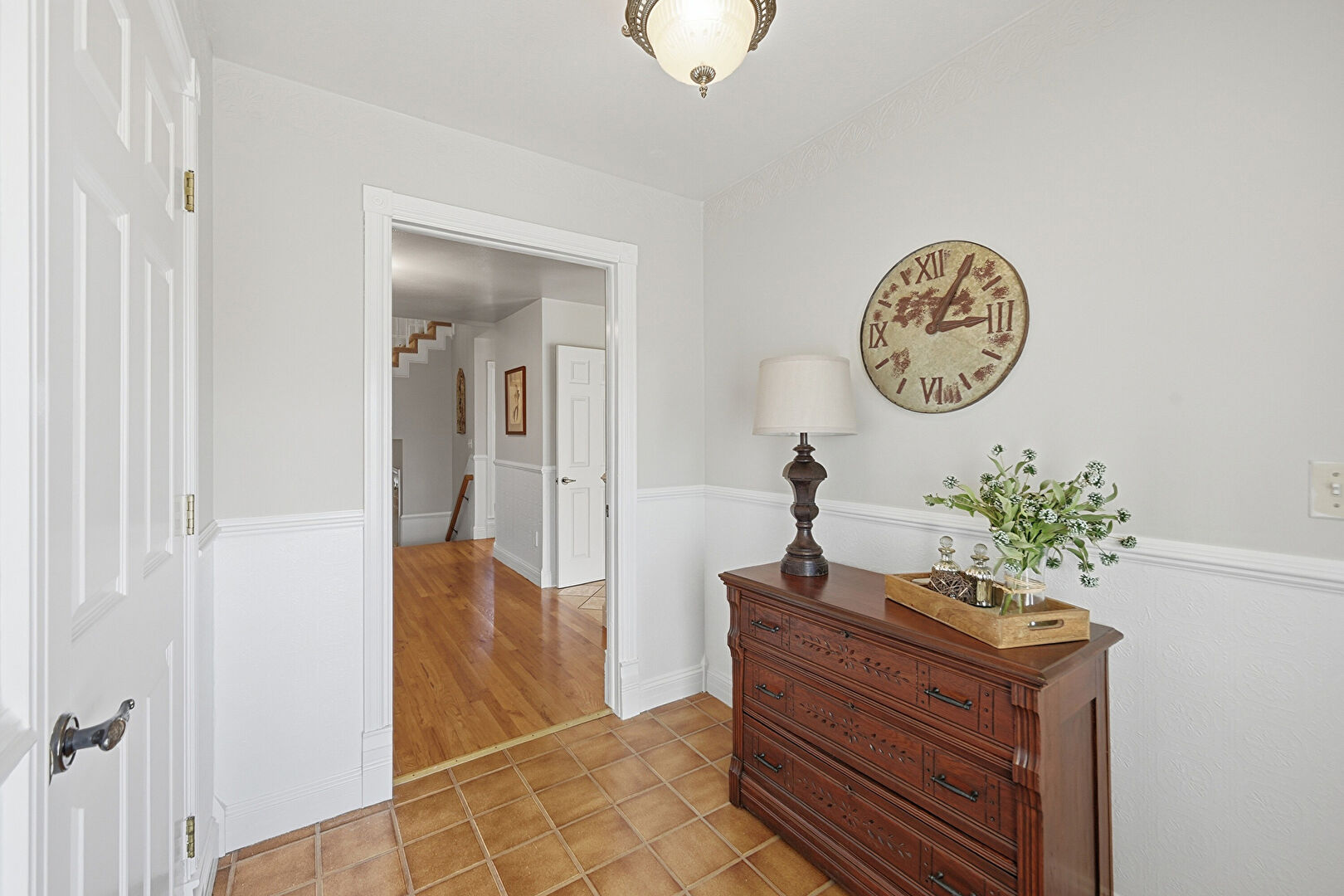 Drywall, Stairs, Tile Floor, Wood Finish Floor, Baseboards Wall, Tile Floor