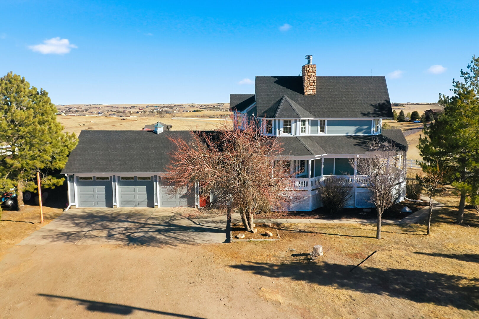 Balcony, Chimney, Concrete Foundation, Downspout, Driveway, Fence, Garage, Gutters, Horizontal Siding, Lawn, Porch, Shake Shingle Siding, Shingle Roof, Stairs, Chimney, Driveway, Horizontal Siding, Lawn, Porch