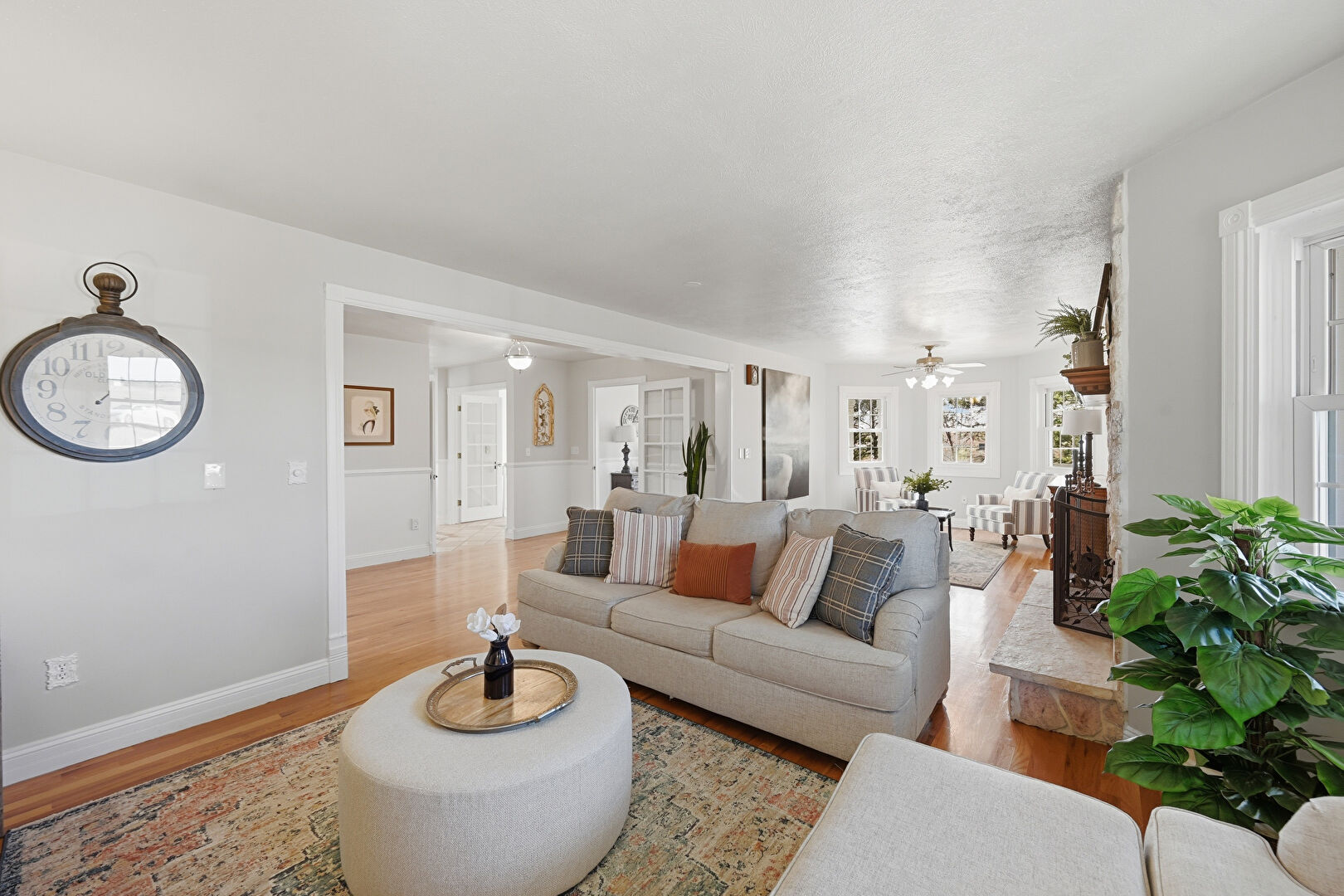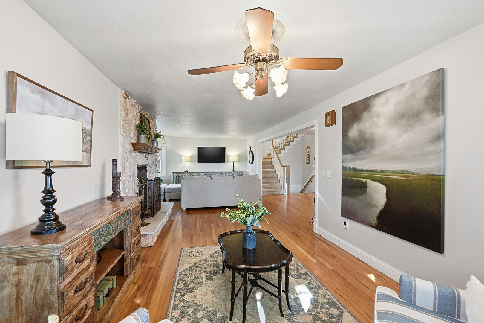 Baseboards Wall, Ceiling Fan, Drywall, Fireplace, Natural Light, Smoke Carbon Monoxide Detector, Stairs, Textured Ceiling, Wood Finish Floor, Baseboards Wall, Ceiling Fan, Natural Light