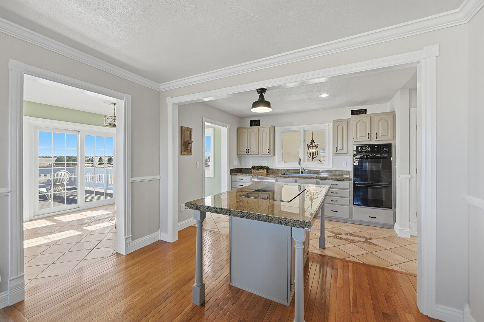 Baseboards Wall, Crown Molding, Drywall, L Shaped Kitchen, Natural Light, Notable Chandelier, Tile Floor, Crown Molding, Double Oven