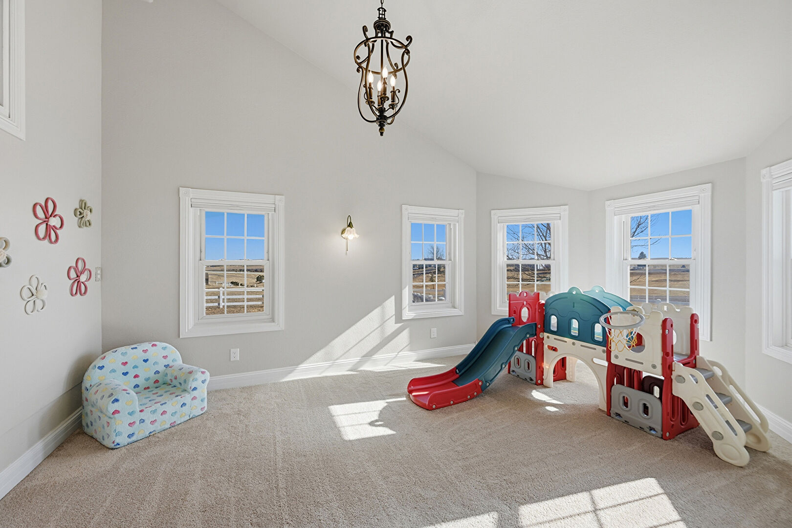 Baseboards Wall, Carpet, Drywall, High Ceiling, Natural Light, Notable Chandelier, Vent, Notable Chandelier, Vaulted Ceiling