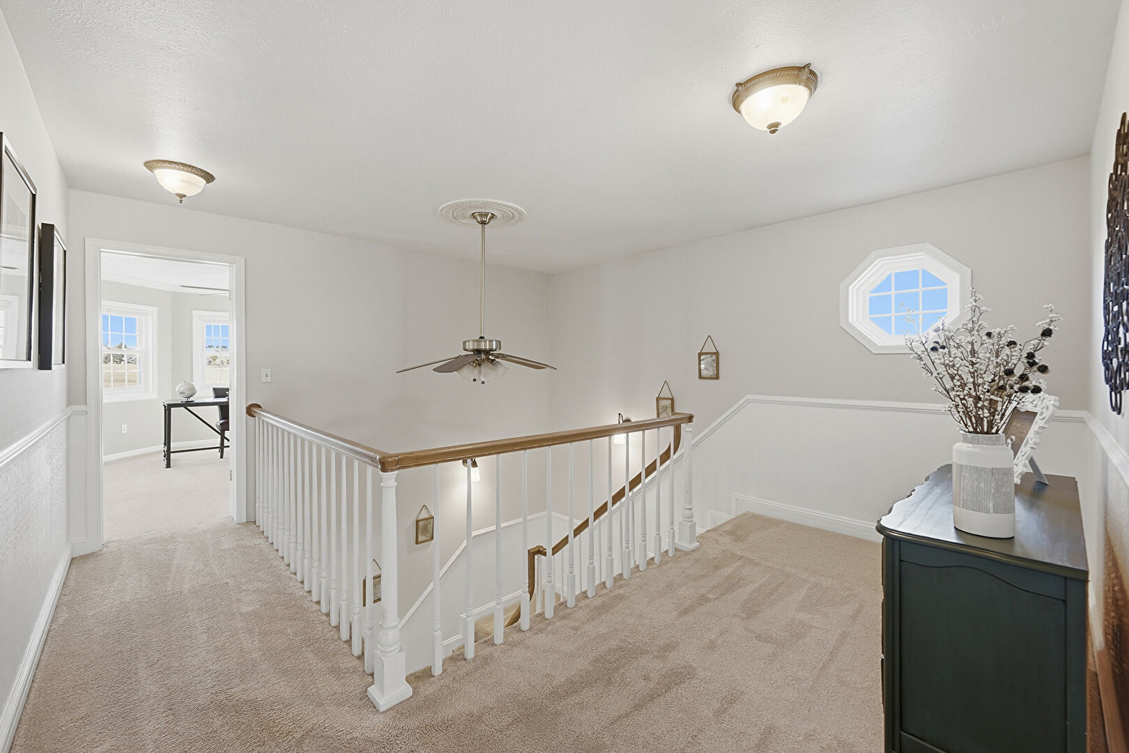 Carpet, Drywall, Natural Light, Upstairs Landing, Baseboards Wall