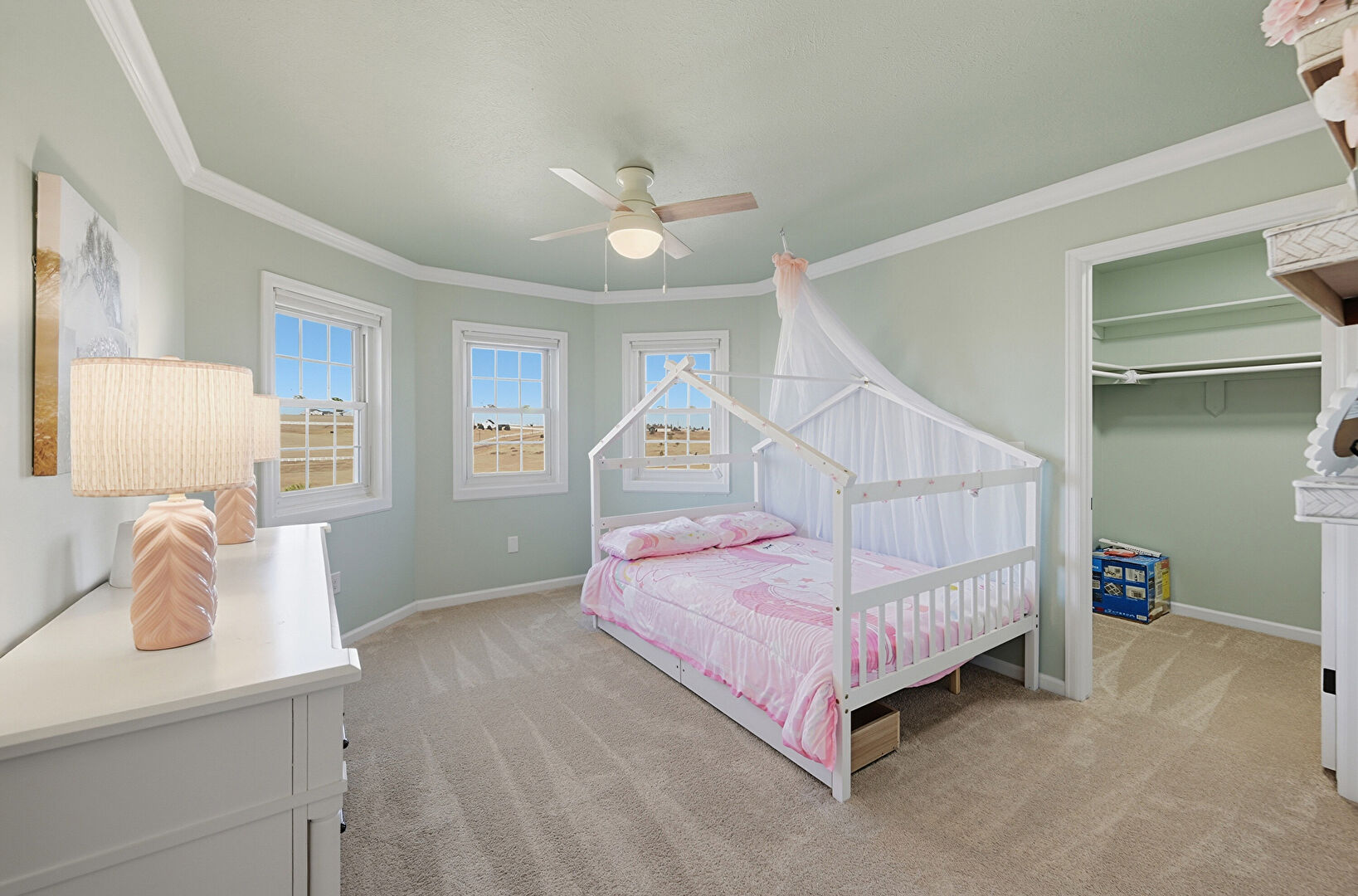 Accent Wall, Baseboards Wall, Carpet, Ceiling Fan, Crown Molding, Drywall, Natural Light, Nursery, Radiator, Walk In Closet, Wallpaper Wall, Carpet, Crown Molding