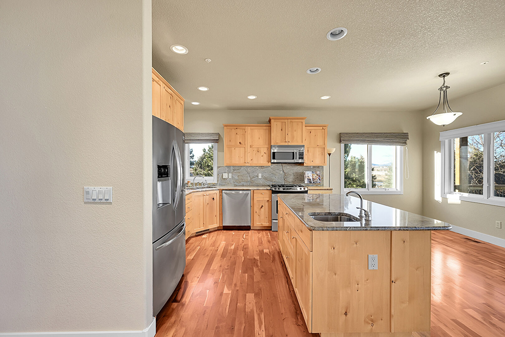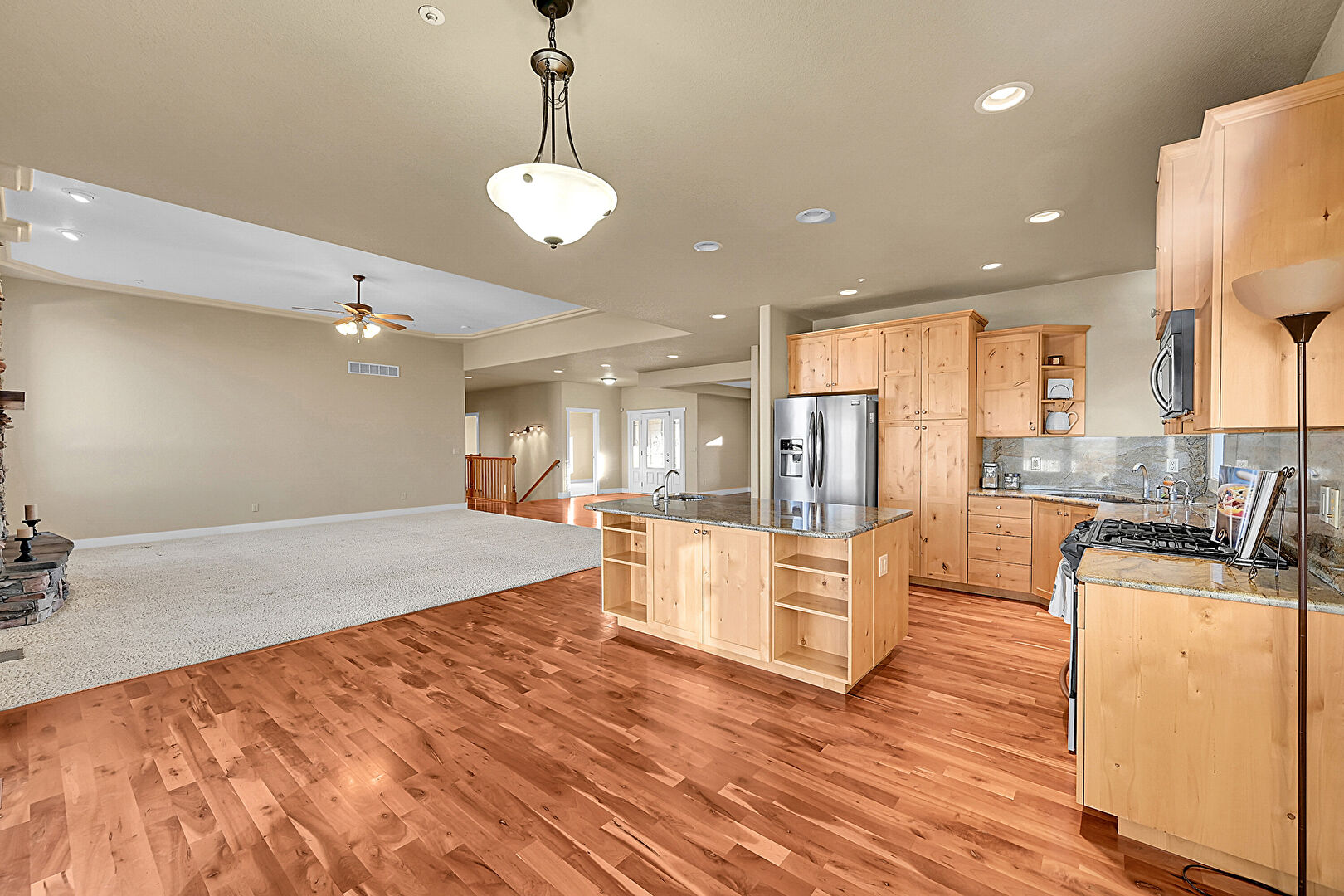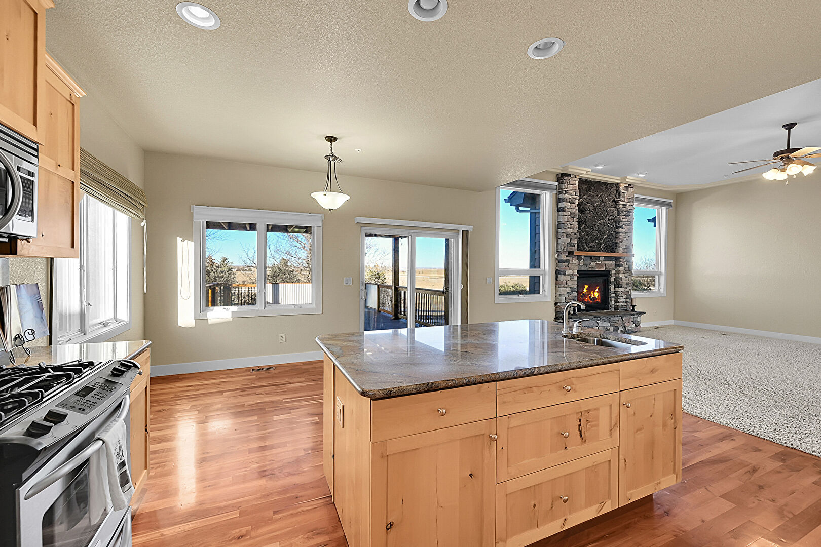 Baseboards Wall, Ceiling Fan, Crown Molding Cabinets, Drywall, Fireplace, Kitchen Island, L Shaped Kitchen, Natural Light, Open Shelves, Opens To Living Area, Pendant Lighting, Recessed Lighting, Shaker Cabinets, Stone Countertops, Textured Ceiling, Tray Ceiling, Vent, Wood Finish Floor, Ceiling Fan, Crown Molding Cabinets, Drywall, Stone Countertops, Textured Wall