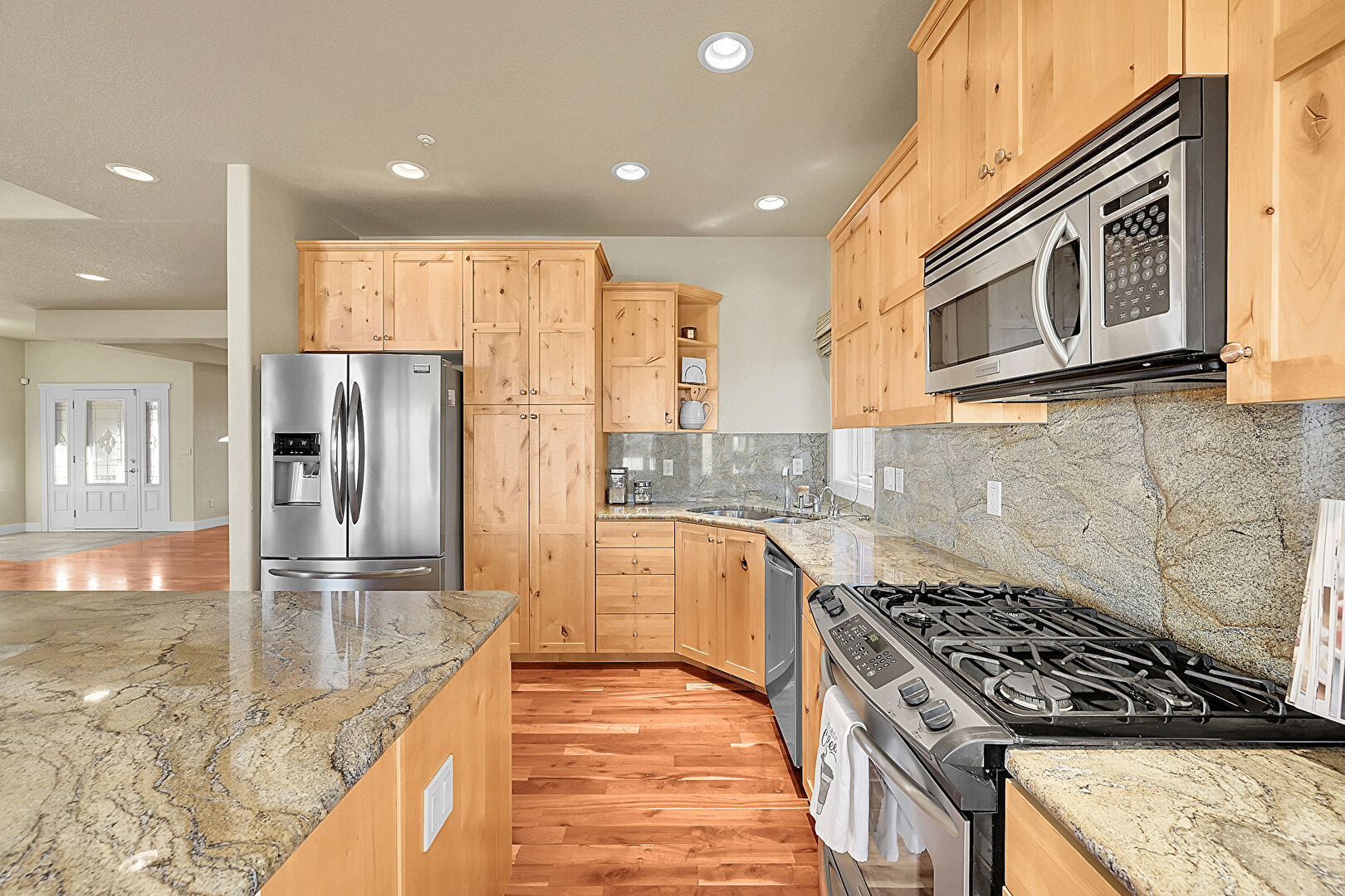 Baseboards Wall, Drywall, Natural Light, Recessed Lighting, Shaker Cabinets, Stone Countertops, Textured Ceiling, Tile Floor, Carpet