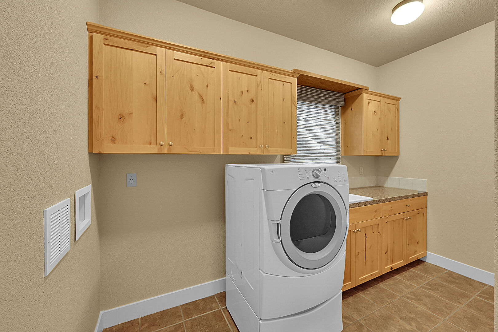Baseboards Wall, Laundry, Natural Light, Textured Ceiling, Textured Wall, Tile Floor, Washer Dryer, Vent