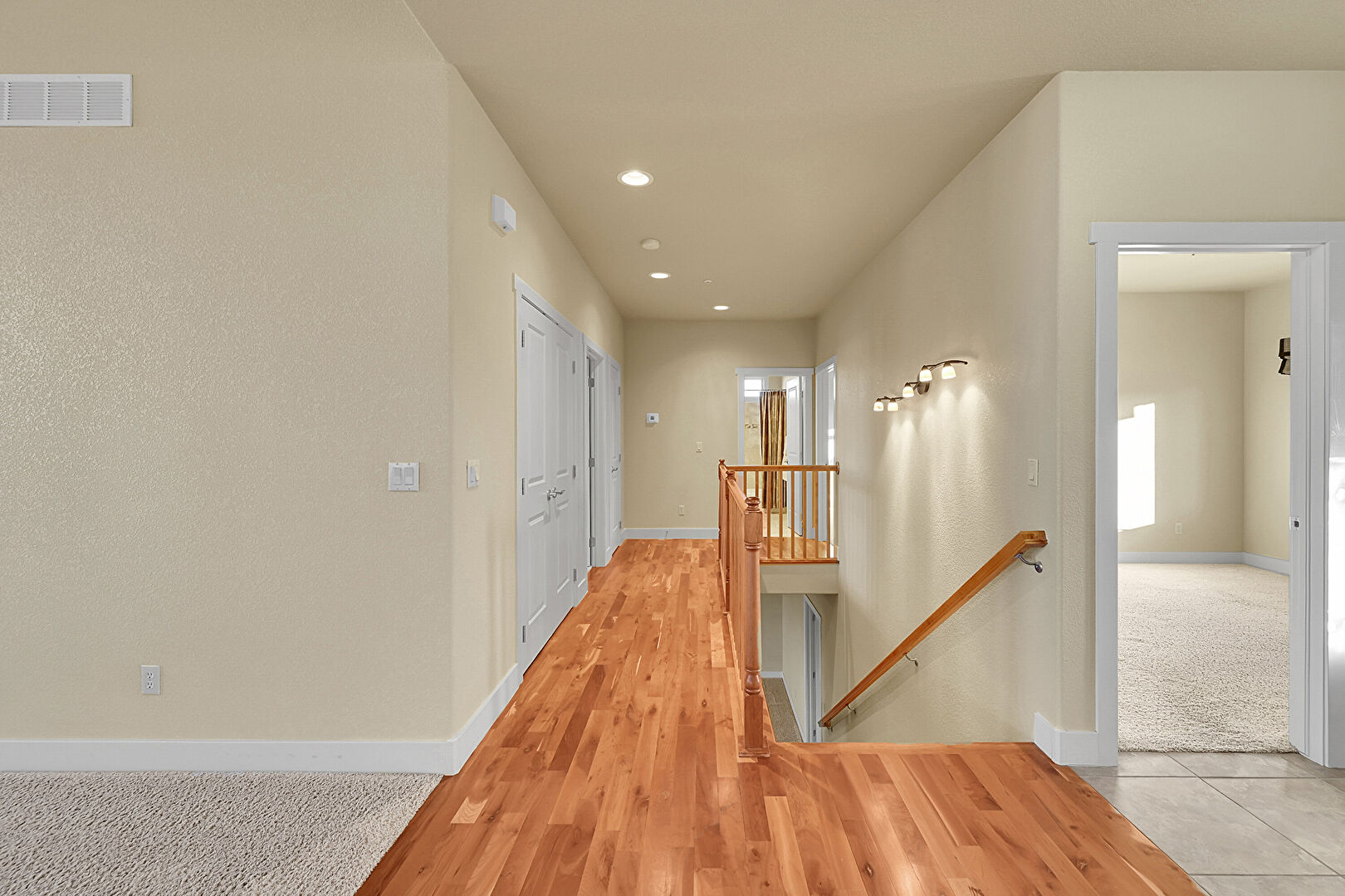 Baseboards Wall, Carpet, Drywall, Natural Light, Upstairs Landing, Vent, Wood Finish Floor, Recessed Lighting