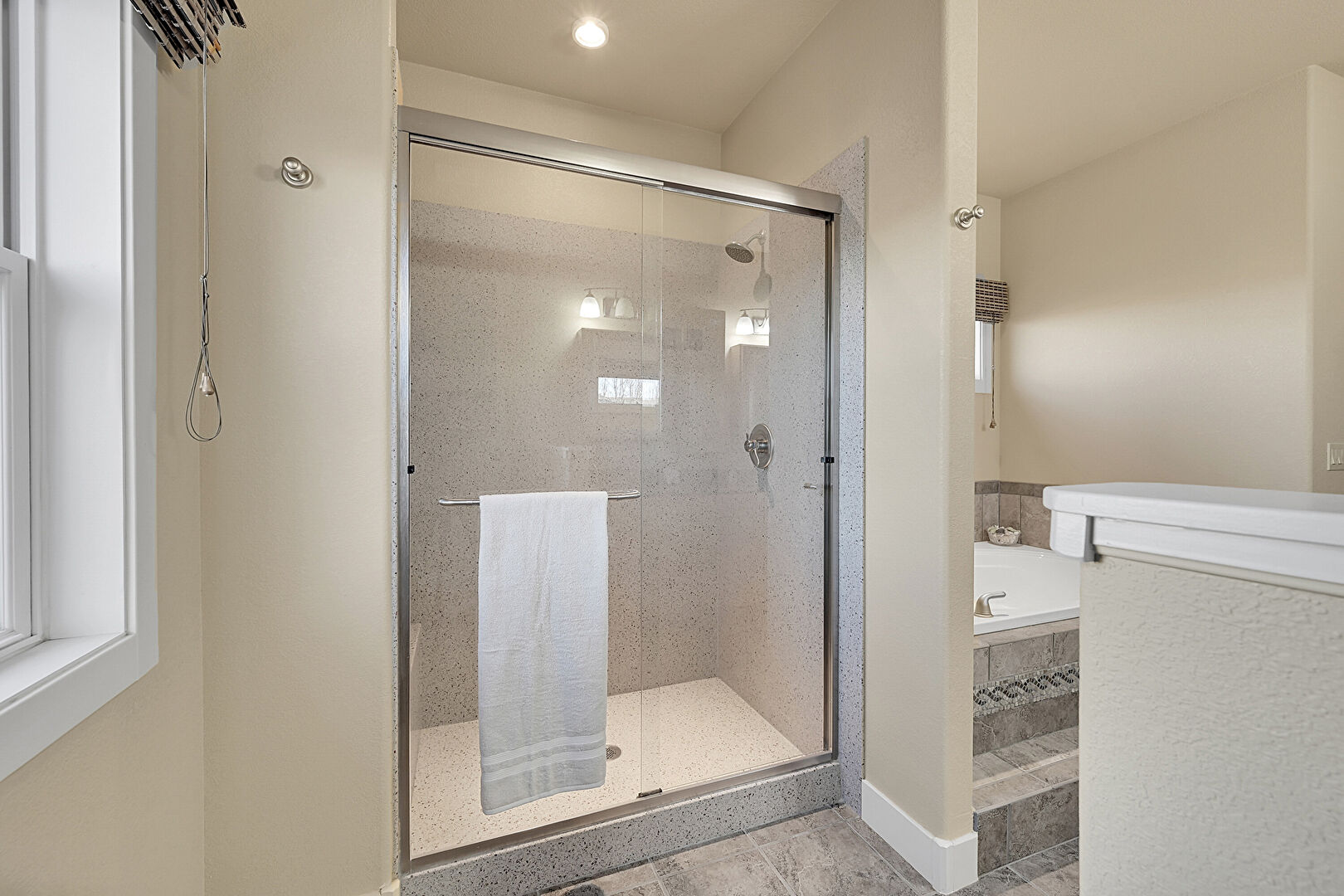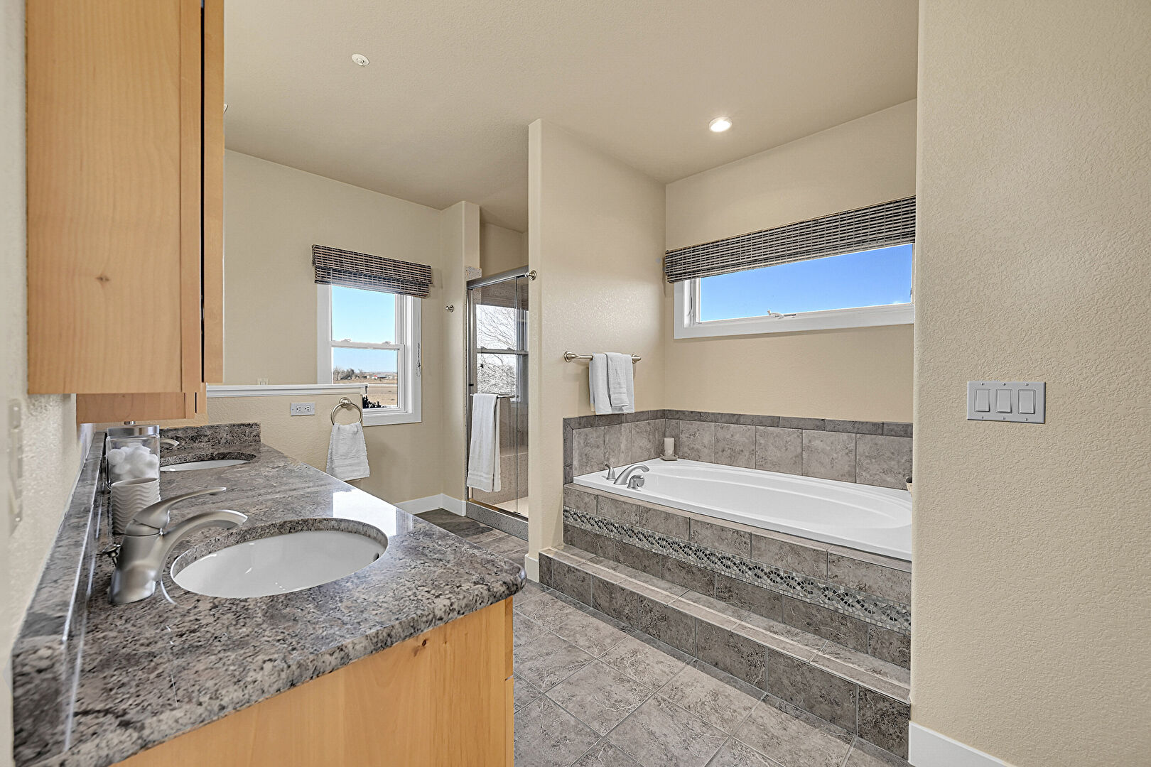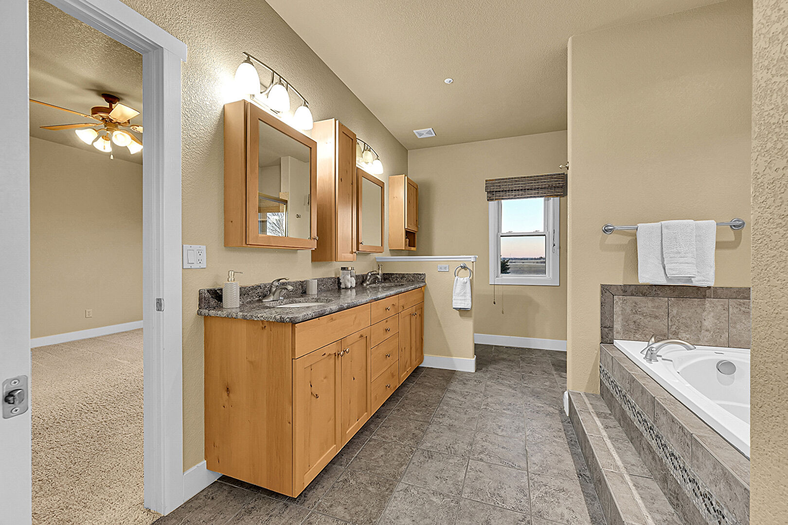 Baseboards Wall, Ceiling Fan, Double Vanity, Drywall, Full Bathroom, Natural Light, Recessed Lighting, Textured Wall, Tile Floor, Vent, Baseboards Wall, Natural Light, Textured Ceiling