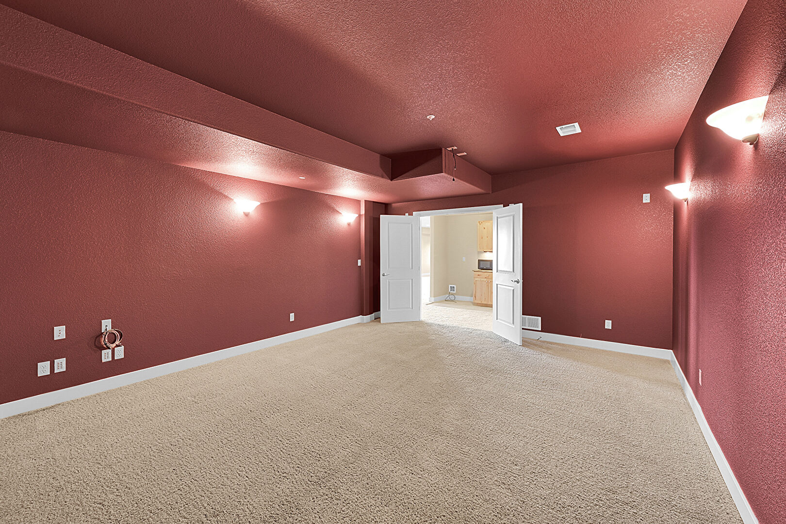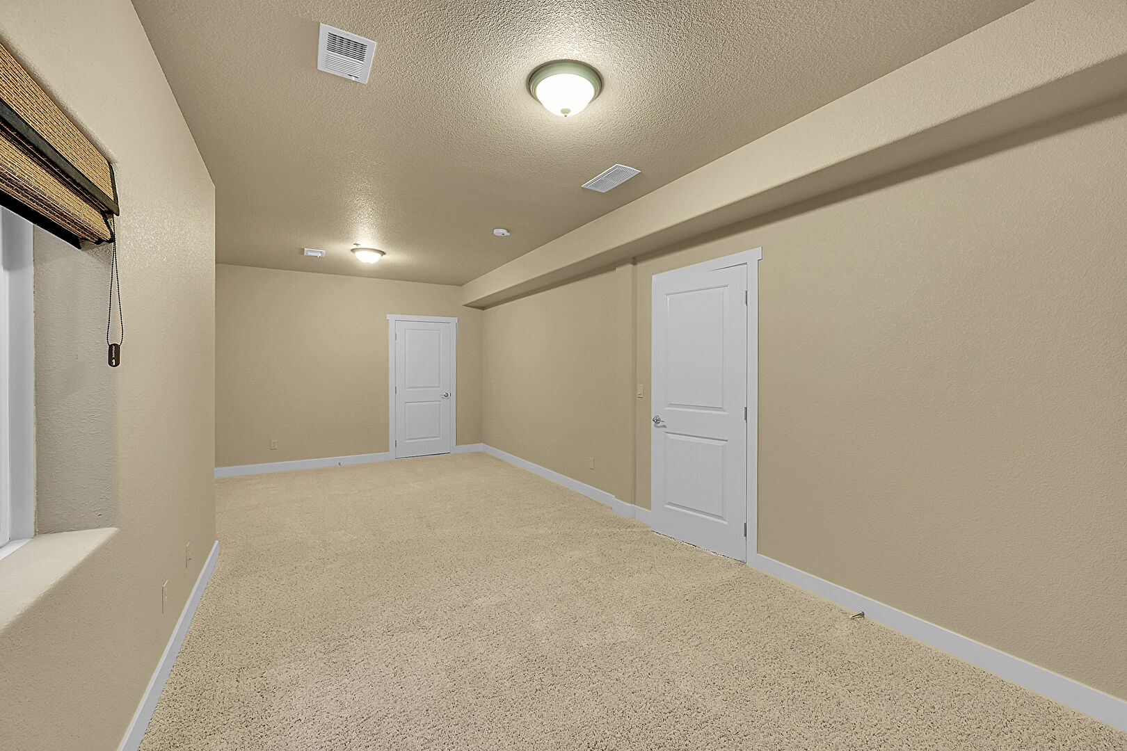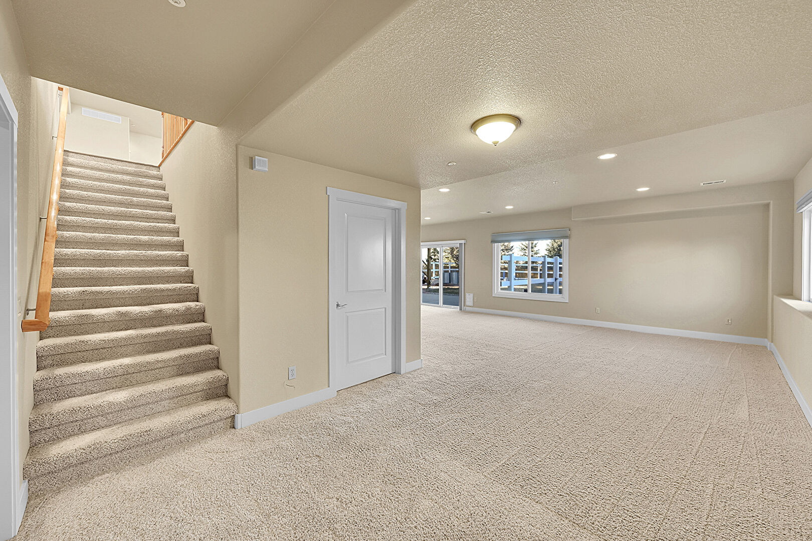 Baseboards Wall, Basement, Carpet, Textured Ceiling, Vent, Drywall