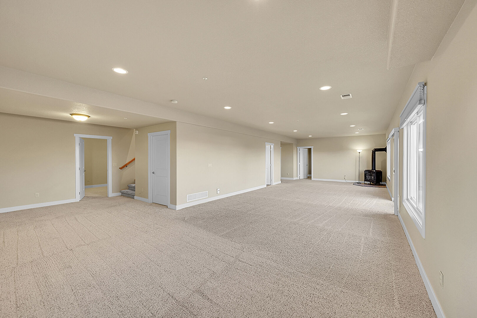 Baseboards Wall, Carpet, Drywall, Natural Light, Recessed Lighting, Stairs, Textured Ceiling, Vent, Wood Stove, Baseboards Wall, Drywall, Recessed Lighting, Stairs