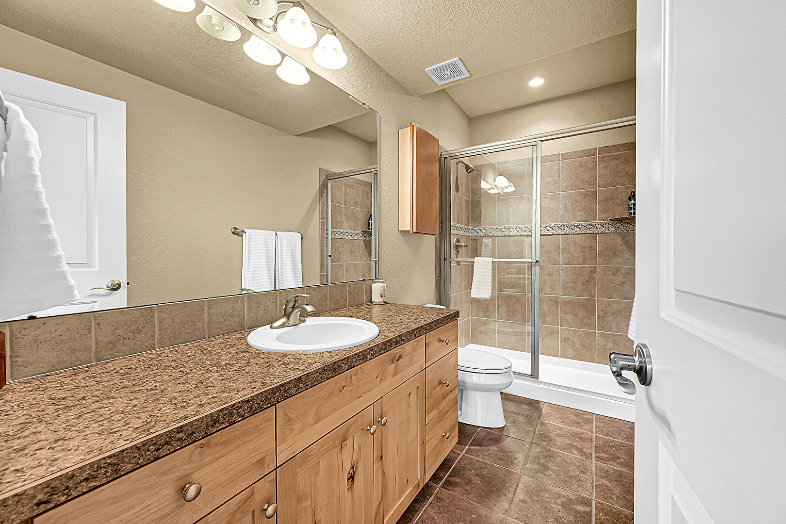 Drywall, Full Bathroom, Recessed Lighting, Textured Ceiling, Tile Floor, Vanity, Vent