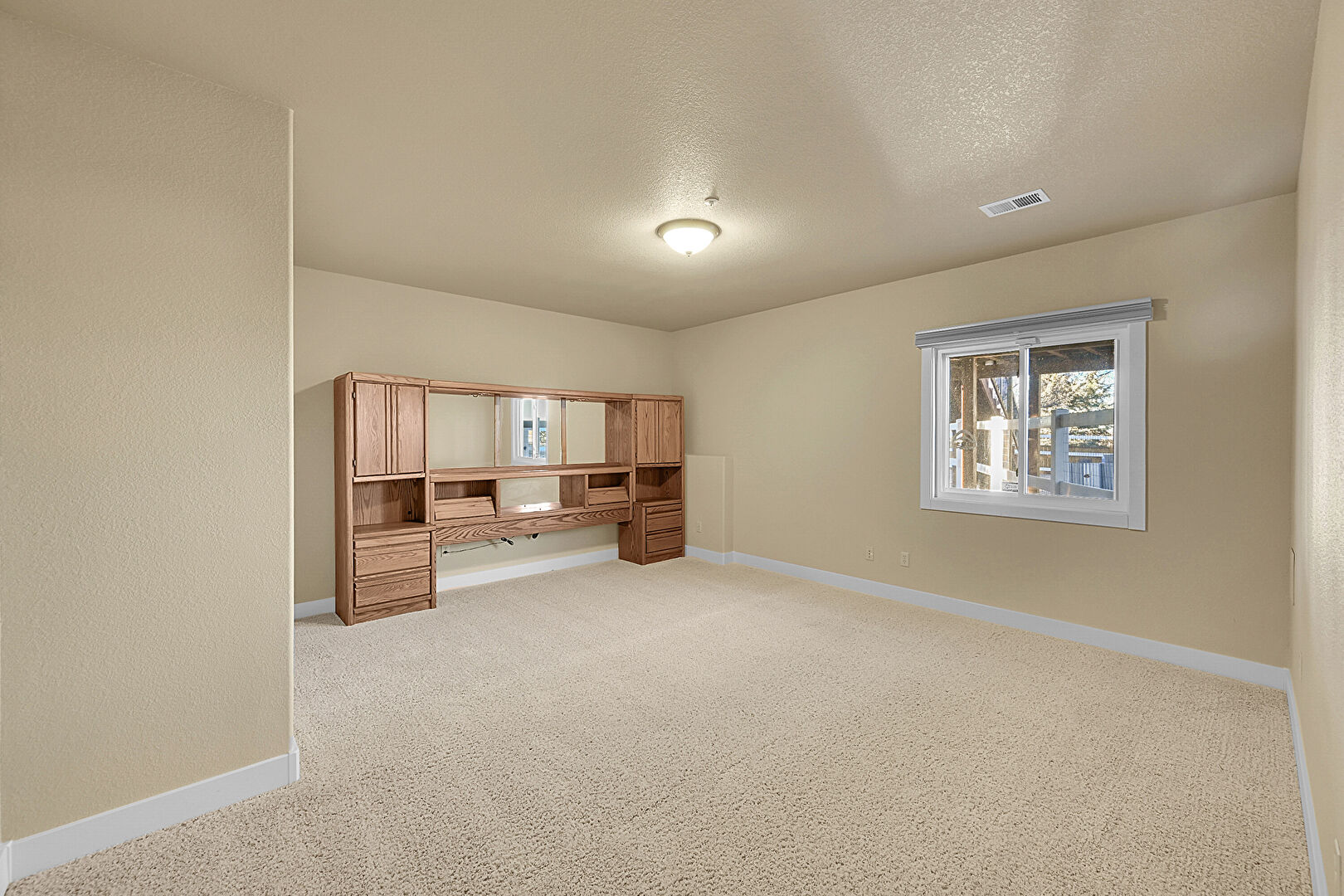 Baseboards Wall, Built In Desk, Carpet, Drywall, Natural Light, Smoke Carbon Monoxide Detector, Textured Ceiling, Textured Wall, Vent, Office Area, Textured Ceiling