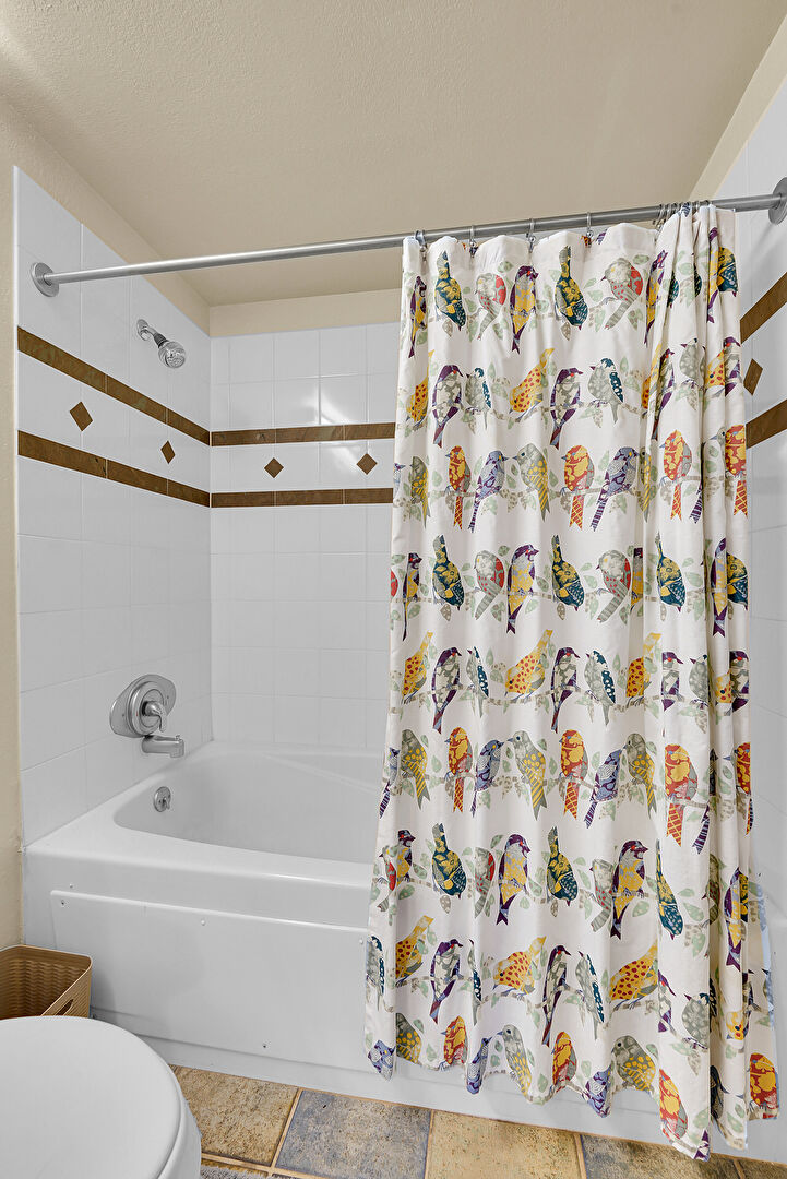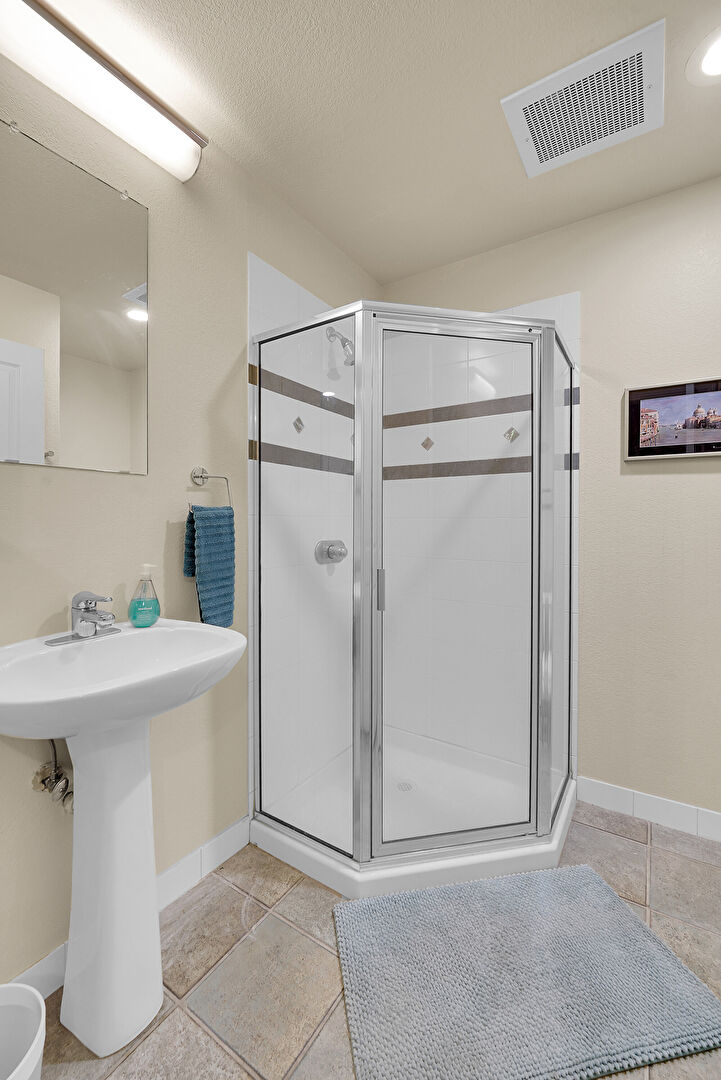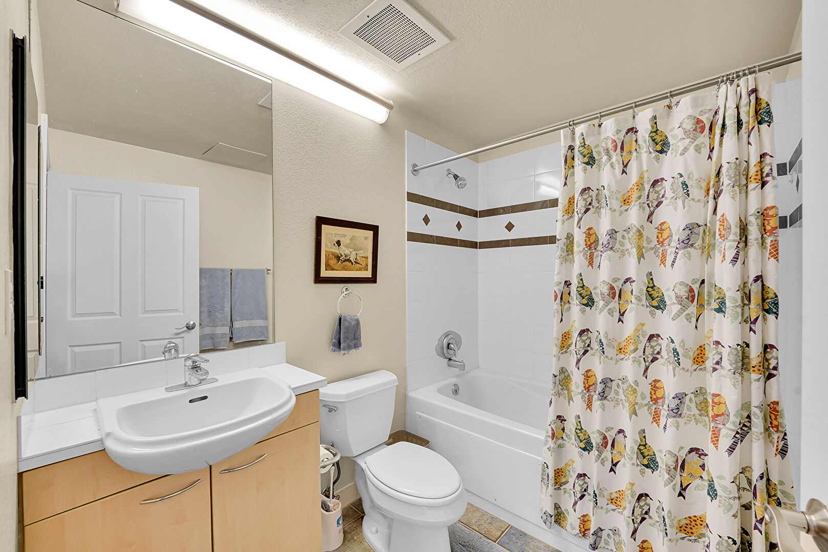 Baseboards Wall, Bidet, Combined Bath Shower, Drywall, Full Bathroom, Textured Ceiling, Tile Floor, Vanity, Vent, Combined Bath Shower, Textured Ceiling, Textured Wall, Vanity