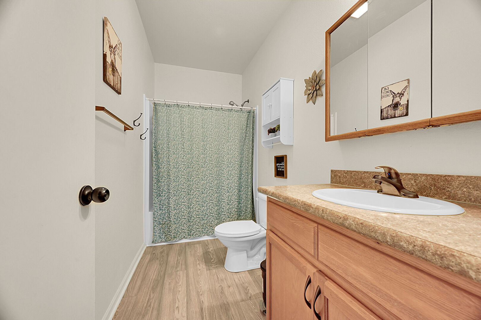 Baseboards Wall, Drywall, Vanity, Wood Finish Floor, Full Bathroom
