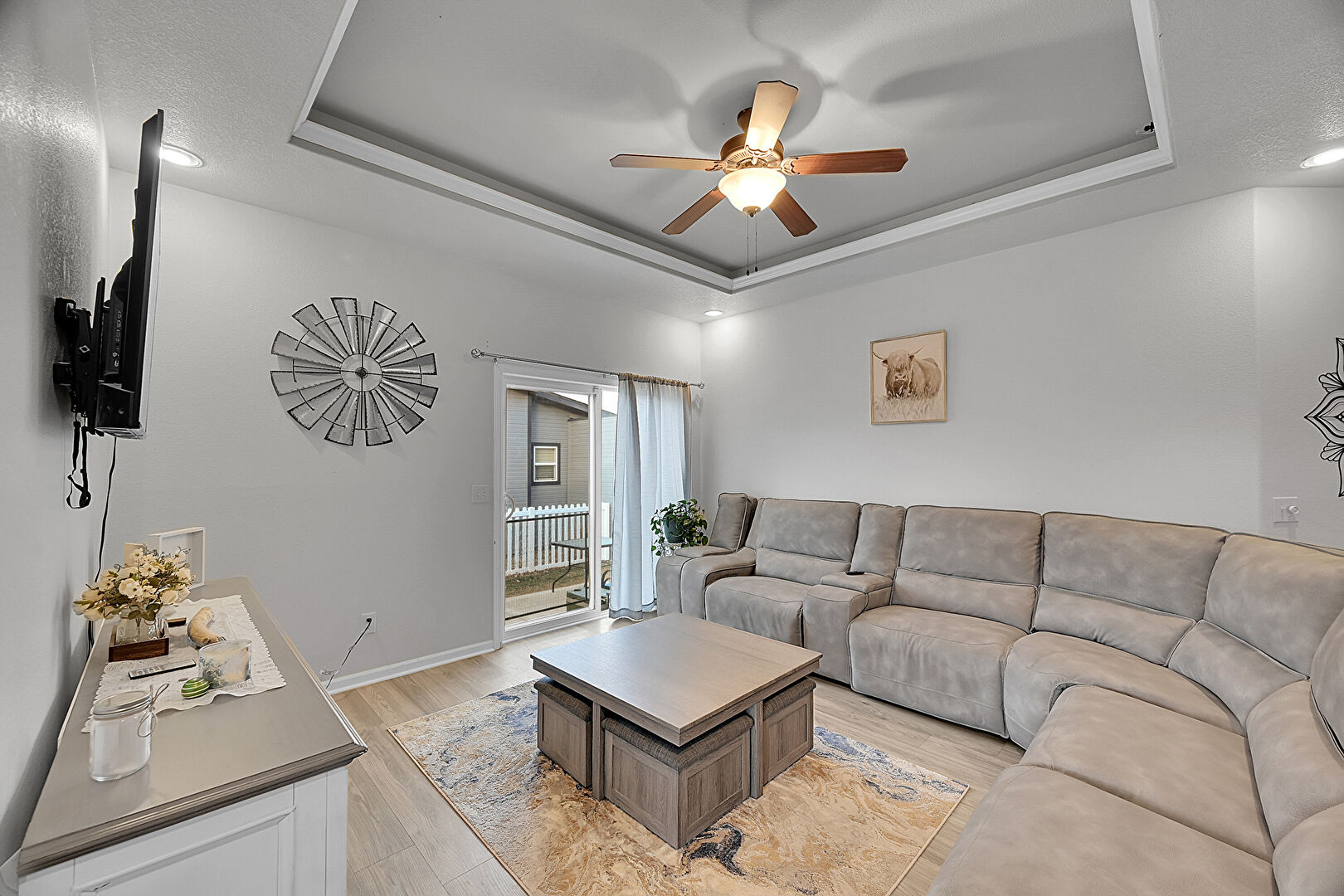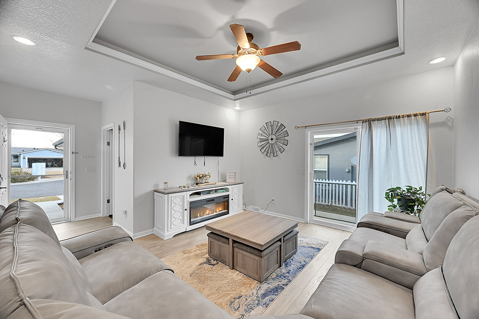 Baseboards Wall, Ceiling Fan, Drywall, Fireplace, Natural Light, Recessed Lighting, Tray Ceiling, Wood Finish Floor, Baseboards Wall, Textured Ceiling