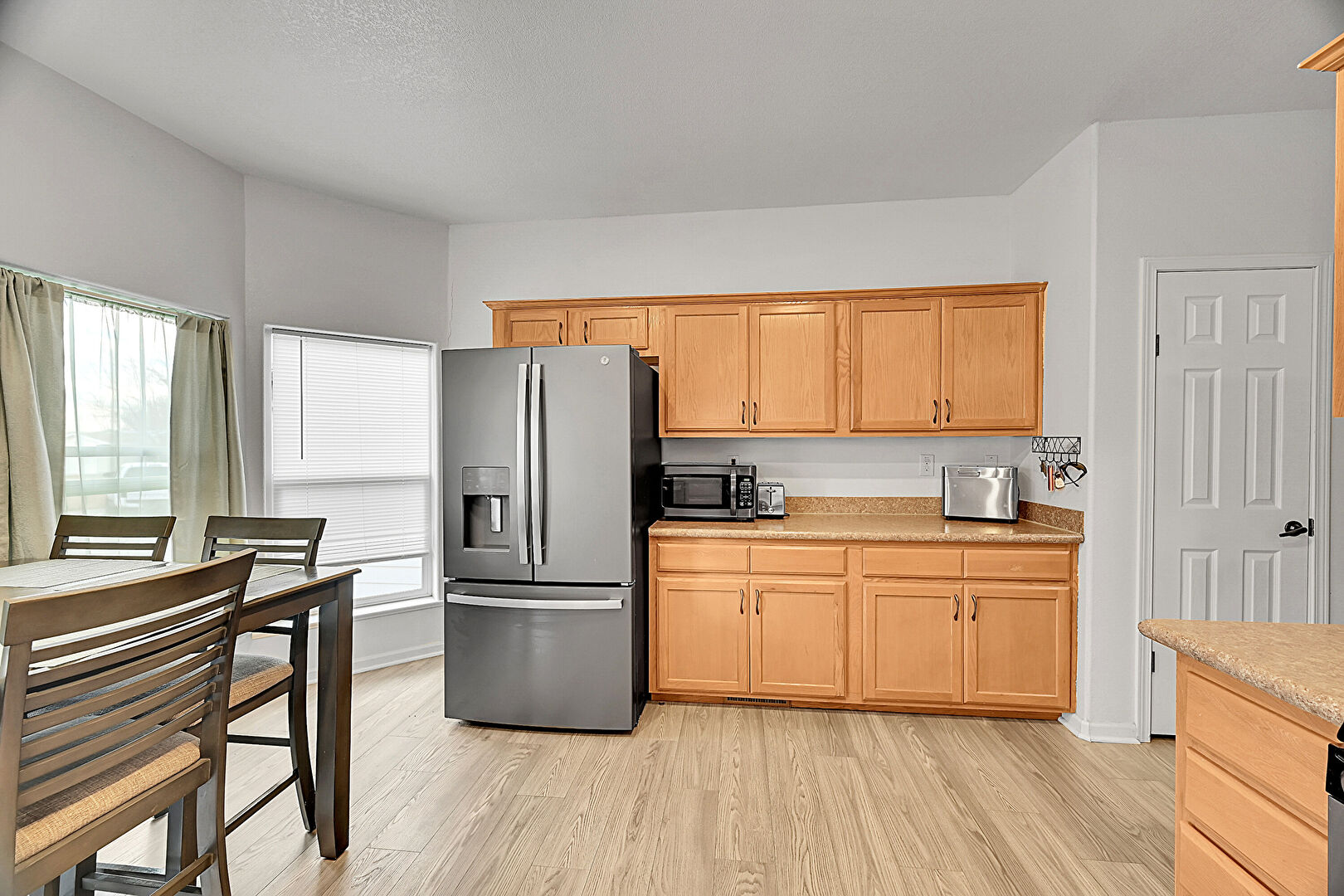 Baseboards Wall, Crown Molding Cabinets, Drywall, Natural Light, Recessed Lighting, Shaker Cabinets, Textured Ceiling, Toaster, Wood Finish Floor, Crown Molding Cabinets, Drywall